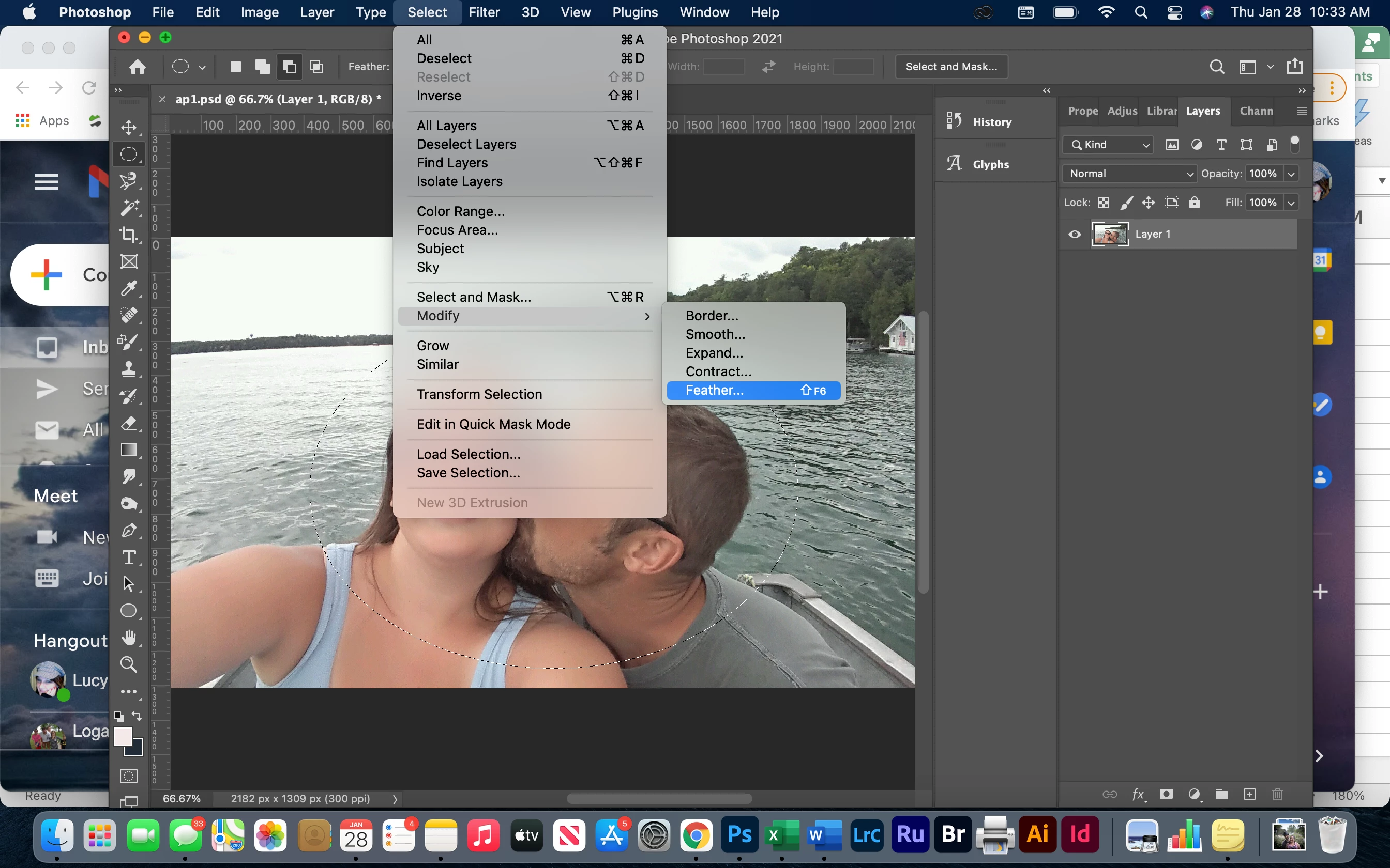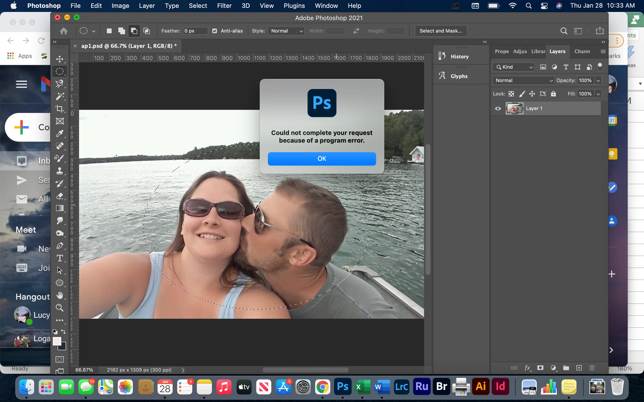 I have Photoshop 2021. Using the elliptical marquee tool, I am trying to cut a a section of a photo to add to a project using: Select >> Modify >> Feather. I get an error message: "could not complete your request because of a program error". Can someone help?