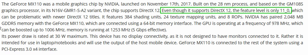 @Helena30873689afai the geforce mx110 does not have full DirectX 12 support, the feature level of that GPU is only 11, Photoshop requires a GPU with a feature level of 12 and above.