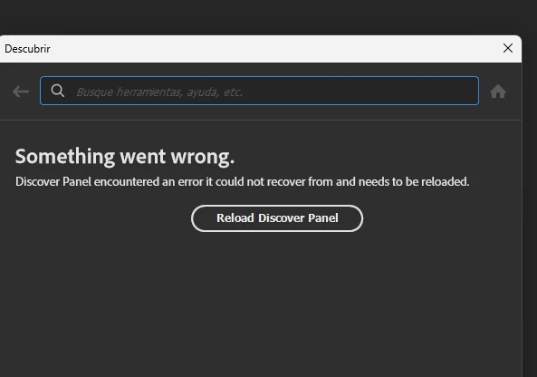 Error: Panel Descubrir no funciona en Photoshop v27.0. aparece el error "Something went wrong. Discover Panel encountered an error..." y ya has intentado borrar la configuración UXP sin éxito.