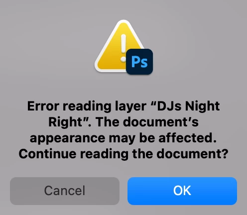 I've got 3 artboards with multiple layers for each artboard et it pops up 1 error for each layer of the document. I didn't try to click OK for every layer error yet though.