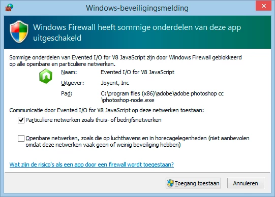 After opening Photoshop CC (14.1.2) I receive a Window Security Alert stated that Windows Firewall has blocked some feature of this app. The details are as follows: Windows Firewall has blocked some of the features of Evented I/O for V8 Javascript on all public and private networks. The publisher is Joyent, Inc. and the path is C:/program files/adobe/adobe photoshop cc (64 bit)/photoshop-node.exe. My question, is it safe to allow Evented I/O for V8 to communicate on private and/or public networds?