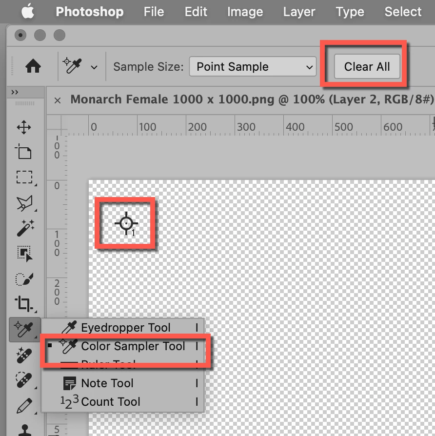 Select the Color Sampler tool ("I"), then choose Clear All in the options bar for the Color Sampler tool.
