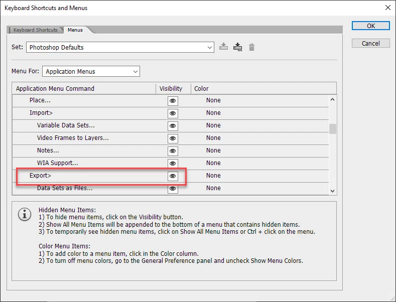 Export as option in photoshop