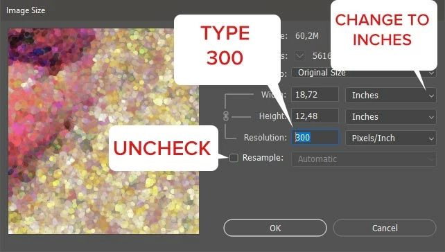 Hi there. I'm trying to export a document from Photoshop for printing, and I'd like the document printed in the dimensions that I originally set for the canvas size - 6.55 inches x 6 inches. When I export the image, the dimensions show as 1965 px x 1800 px. I e-mailed the printer place and the guy is telling me that the document I've sent him is currently 27.29 inches x 25 inches and that I need to re-size the document if I want it printed as 6.55 inches x 6 inches. How do I export the document in the canvas size dimensions of 6.55 x 6 inches? Thank you!