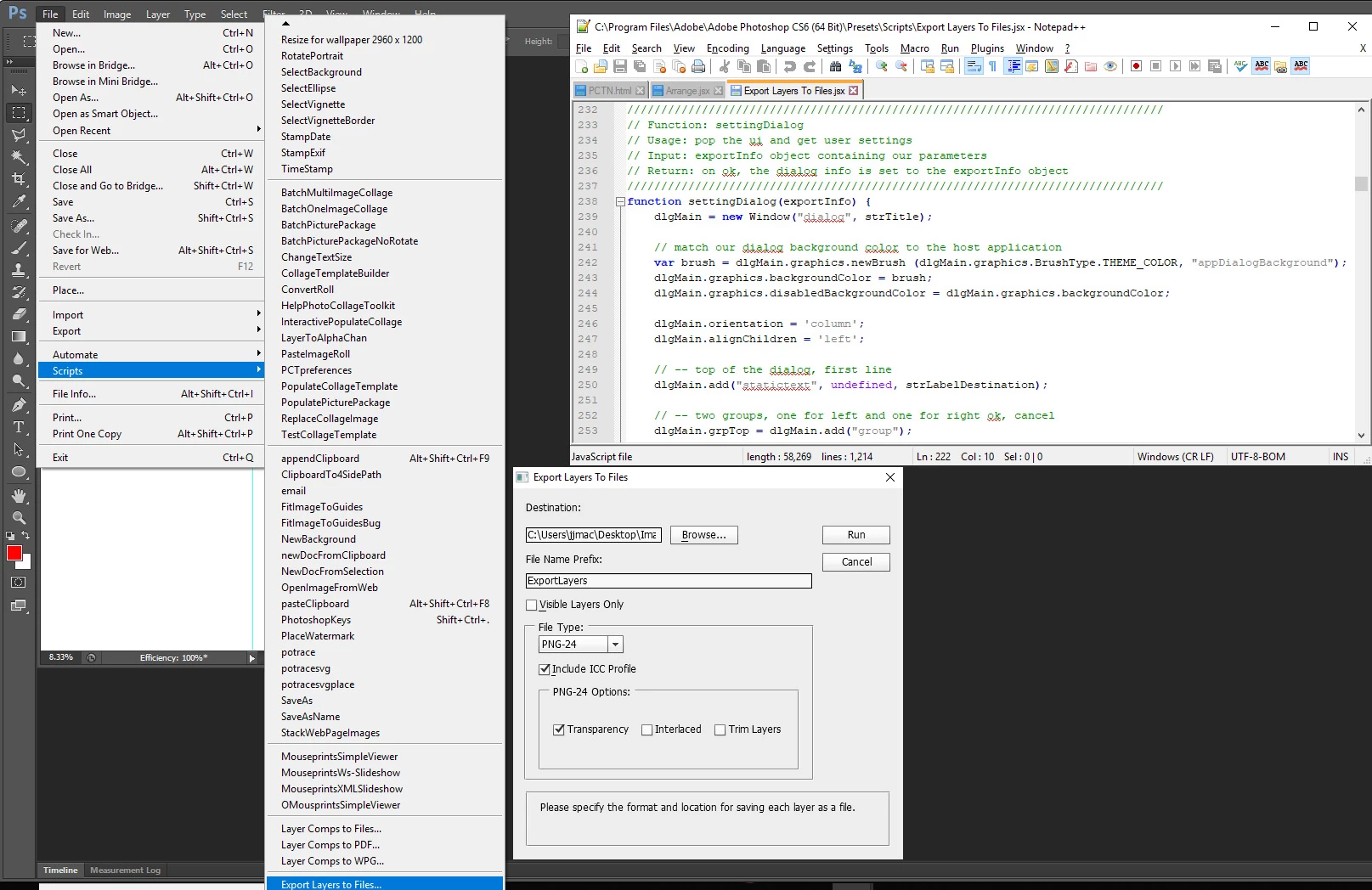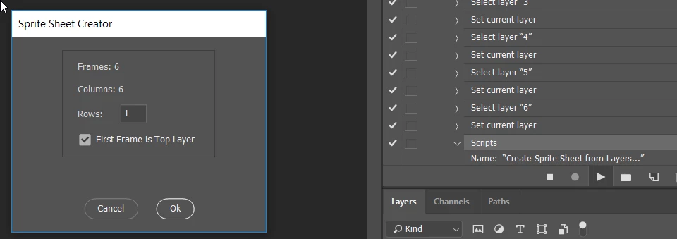 Only Plug-in scripts can bypass displaying their dialogs. Edit the script "create sprites from layers" see if is is a plug-in script like Export Layers to files. If it is in the beginning of the script you will see all of its Dialog setting enumerated in "HARVEST_EXCEPTION_ZSTRING" section