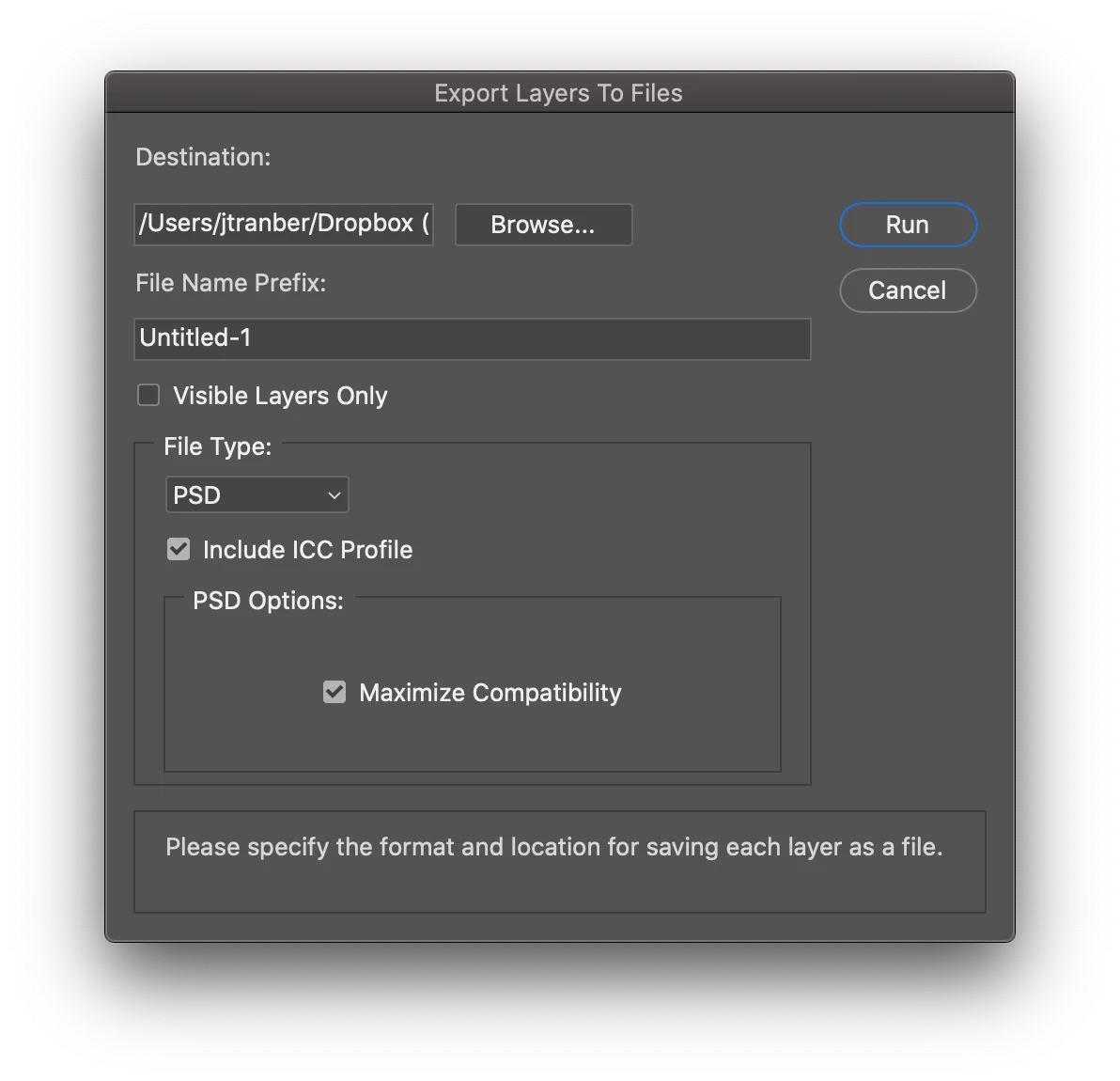 When attempting to export layers to files, nothing happens when you click "run" or "cancel".  As the dialog window stays, Photoshop can't force quit.