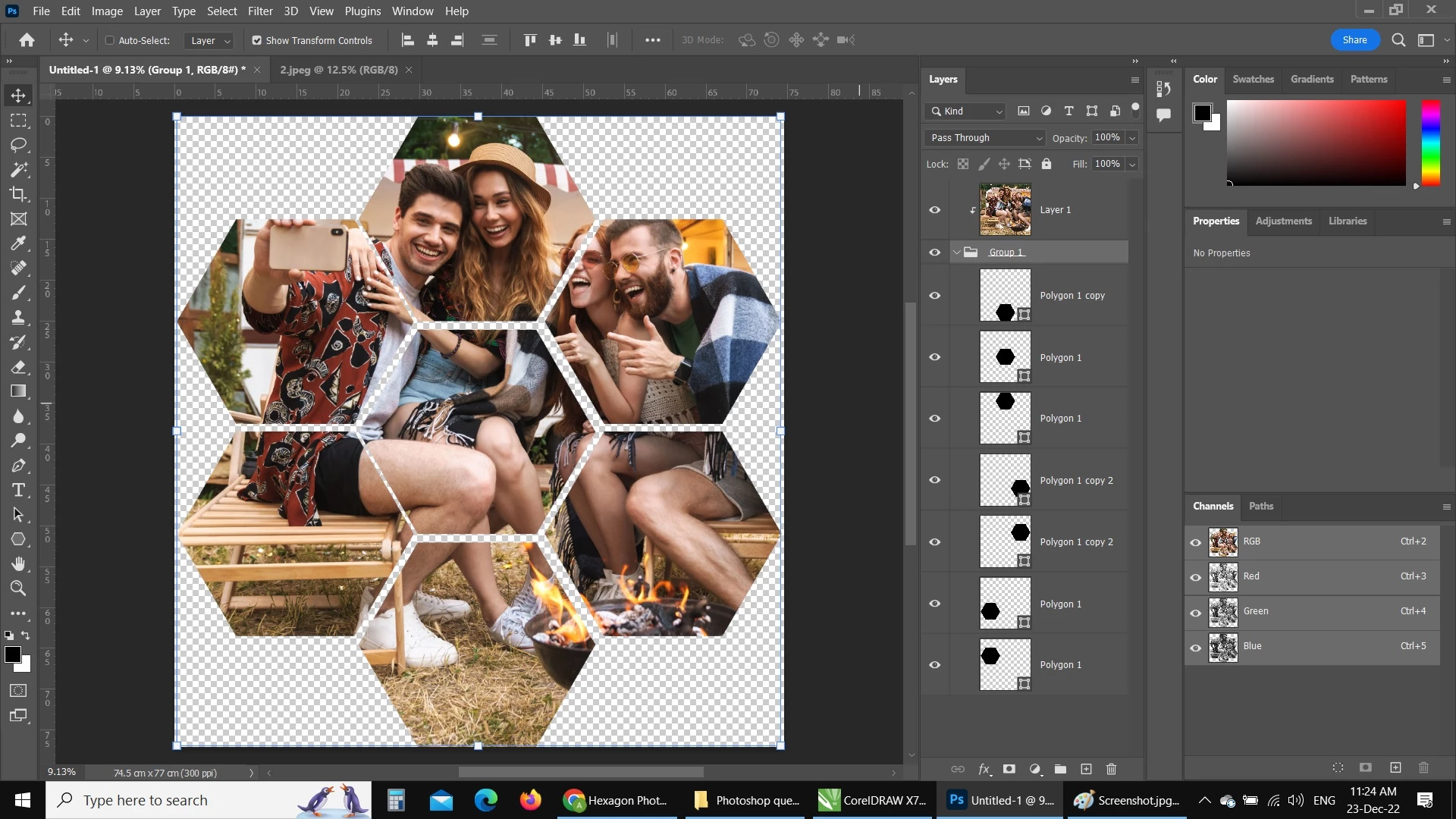 I've tried selecting the group's layers and exporting them, I got seperate files for the shapes without the clipped portion of the photo.