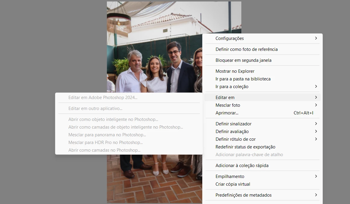 Olá. Estou com todos o aplicativos ADOBE atualizados, porém não consigo exportar fotos reveladas no LR para o PS. Até ontem funcionou normalmente, sem qq problema. Mas hoje nada quer funcionar. A imagem abaixo mostra o que acontece. Não consigo acessar a opção EDITAR EM.