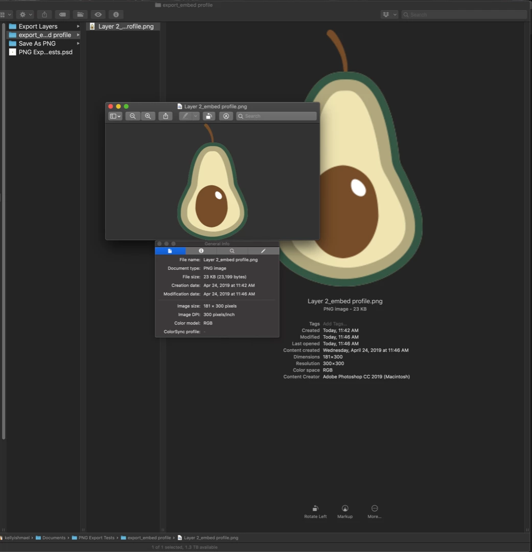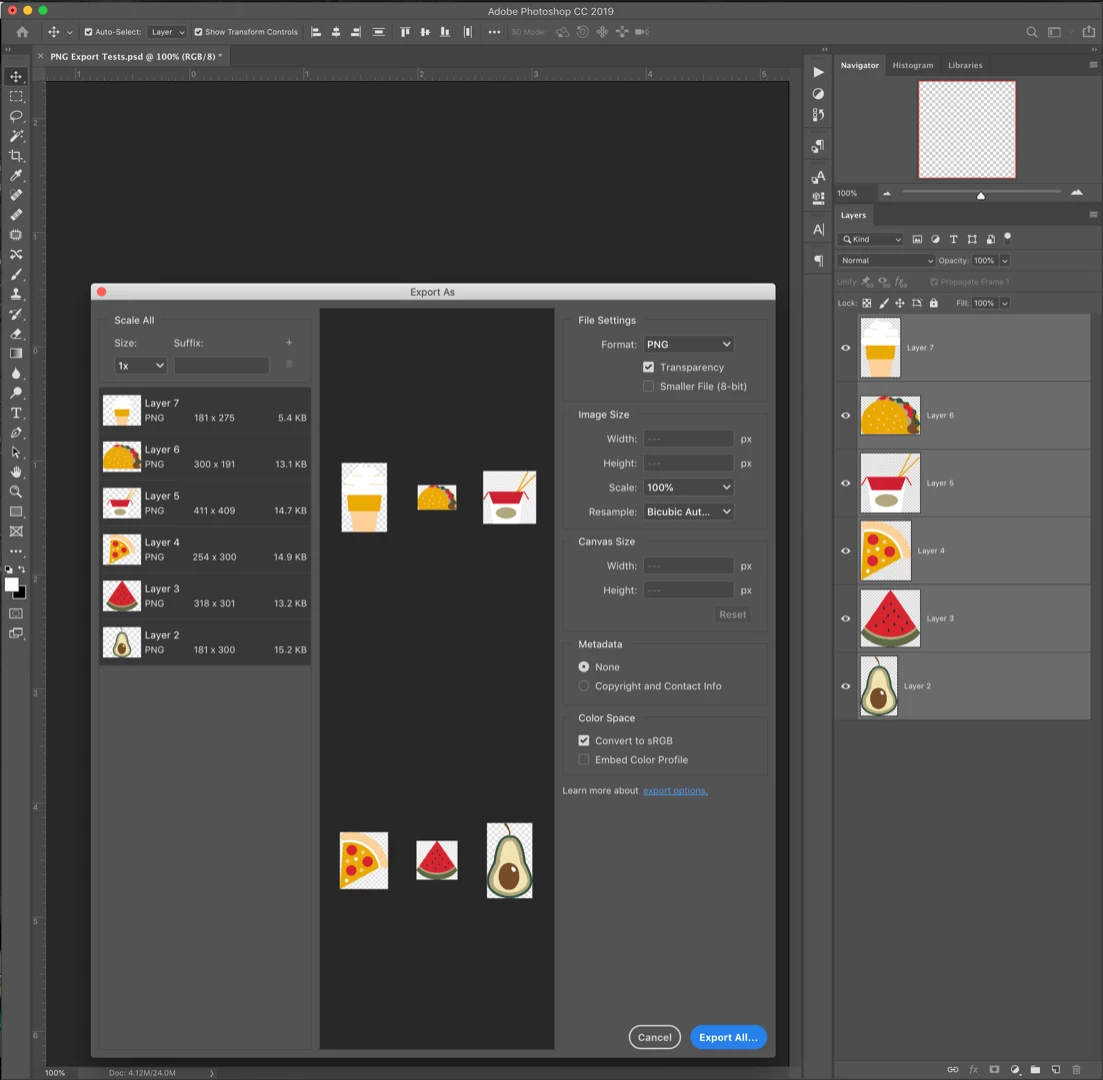 Exporting PNG files with 300 pixels/inch resolution and sRGB color profile