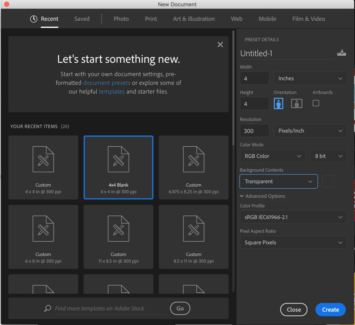 I start the process by creating a new document with a resolution of 300 pixels/inch and sRBG Color Profile.