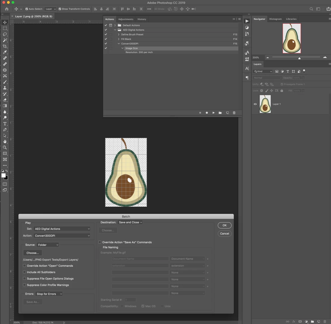 When I open the batch-processed image in Photoshop it confirms the resolution at 300 pixels/inch.