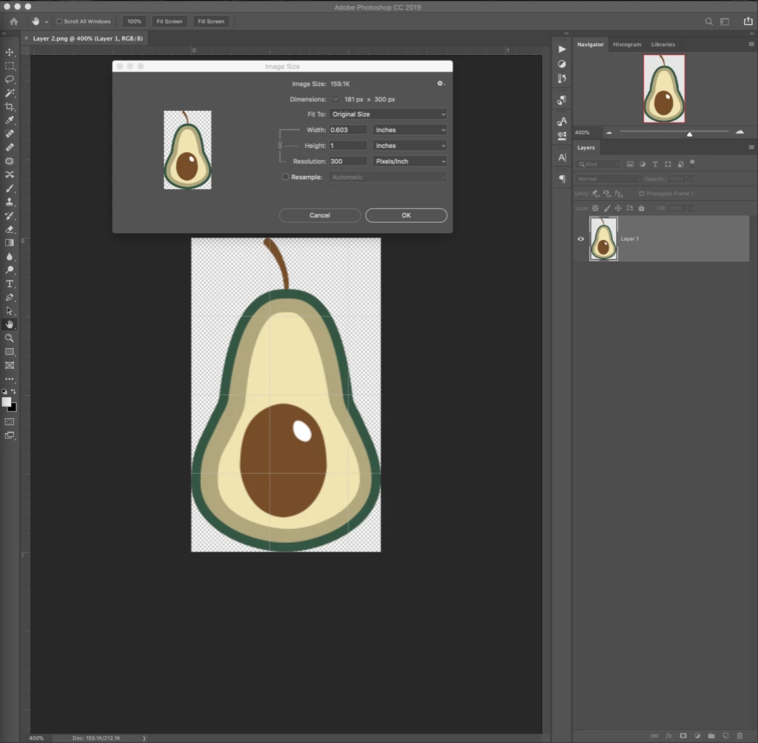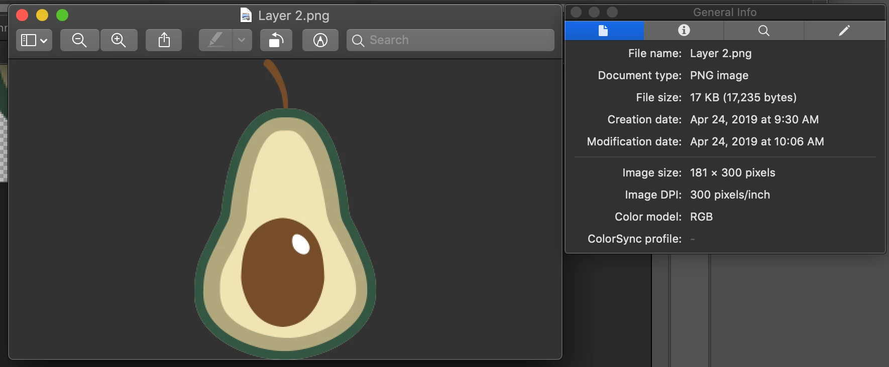To keep this in perspective, that avocado illustration is only 181 x 300 px – which is 1.53 x 2.54 cm @ 300 ppi… Not a very large image as raster images go, it would obviously be best as a vector graphic.