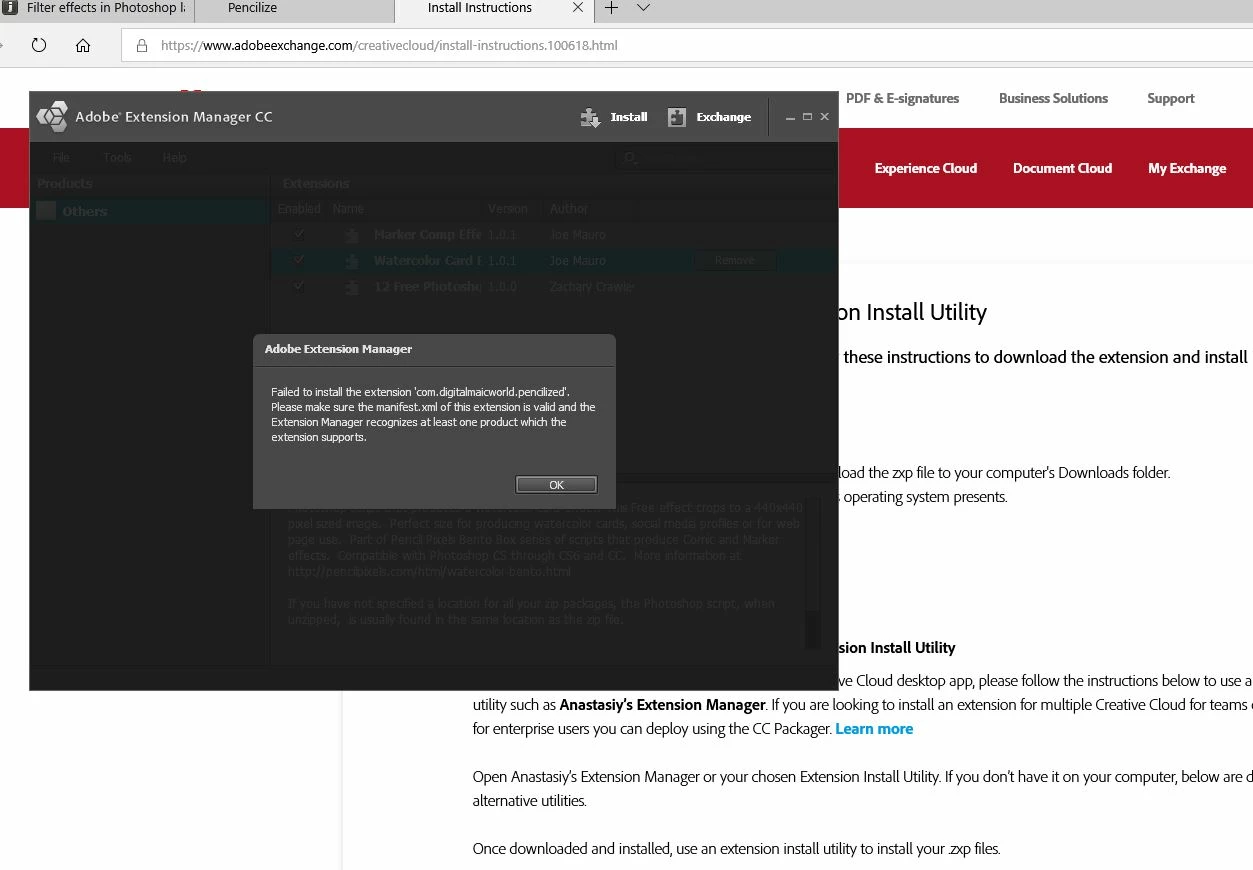 As if anyone would have the foggiest idea what sort of rubbish that is supposed to mean, after repeated installation attempts the Pencilize extension appears in Photoshop under Windows > Extension menu.