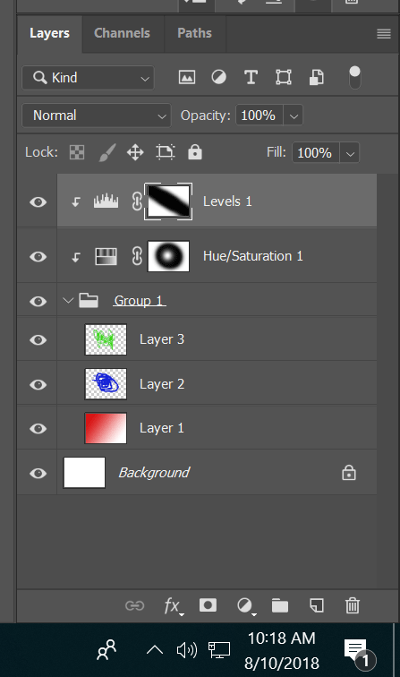 2. create one or more adjustment layers (I don't think type matters, but for repro you might try hue/sat, or levels, as I have below), and set them to clip to the group from step 1.