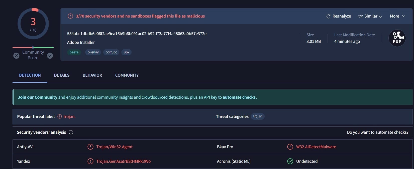 Out of curiosity, I ran a full scan with Virus Total, and it detected the issue shown in the image. My question is: should I be concerned about these three antivirus flags? I'm not sure if they are reliable or if the results are false positives.