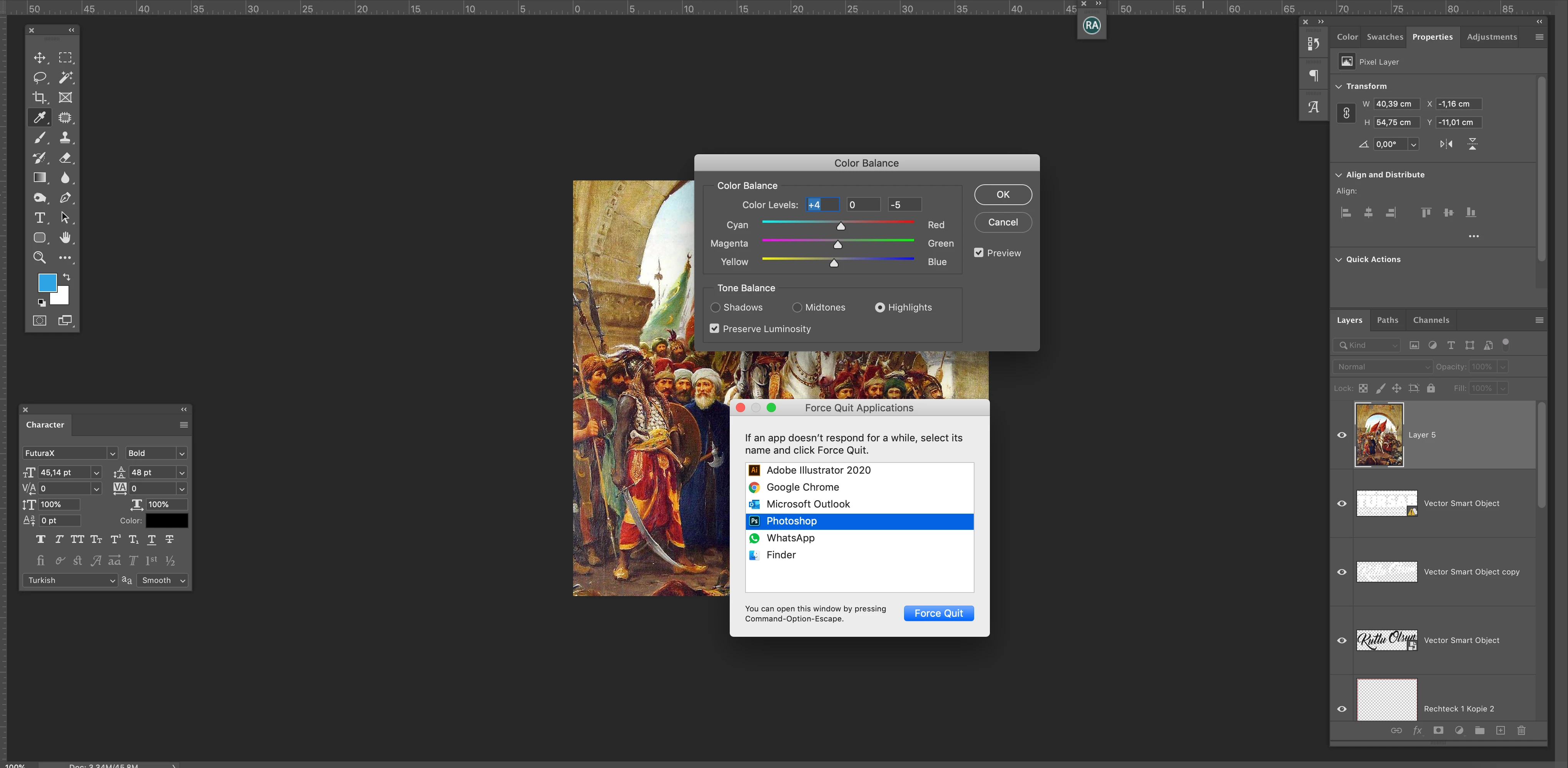 While working in Photoshop, it freezes when you open the color balance and selective color panels. The interesting thing is that it doesn't seem locked in the finder. But he doesn't do anything. It freezes. I can switch to other programs. But I have to close it.