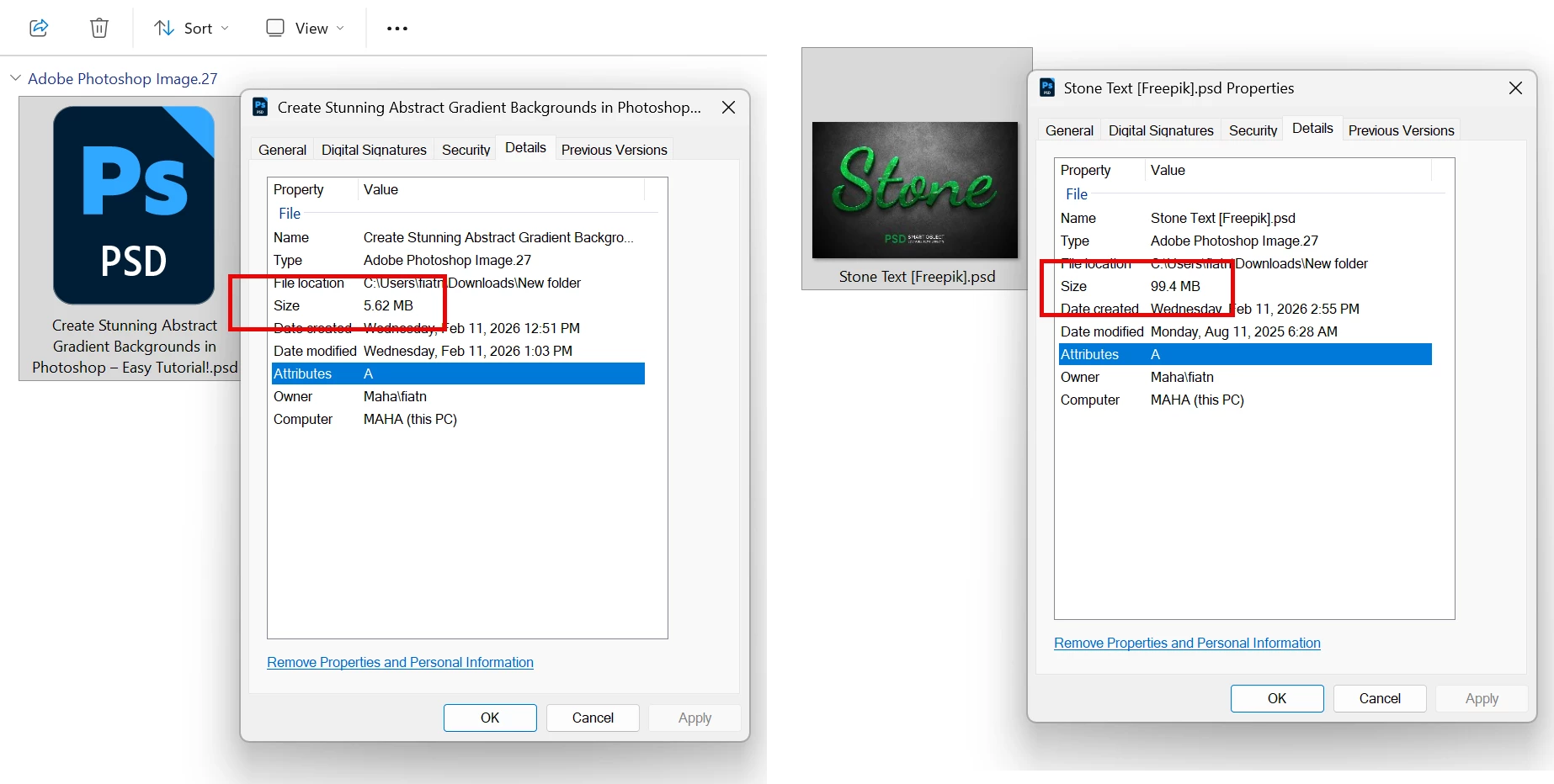 Two Ps files are in Windows Explorer, file sizes are 5.62 MB & 99.4MB respectively. What is reason larger file with 99.4 MB shows the content but smaller file does not show?