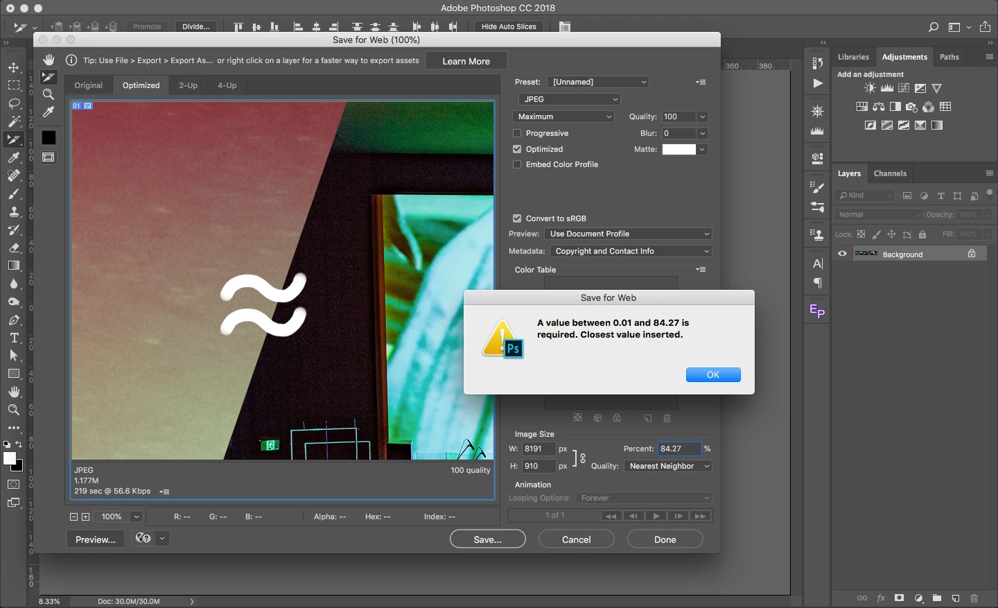 I've done this before, but after updating to Photoshop CC 19.1.6 save for web doesn't seem to export files of that size. It says image size can't be over 84,27%