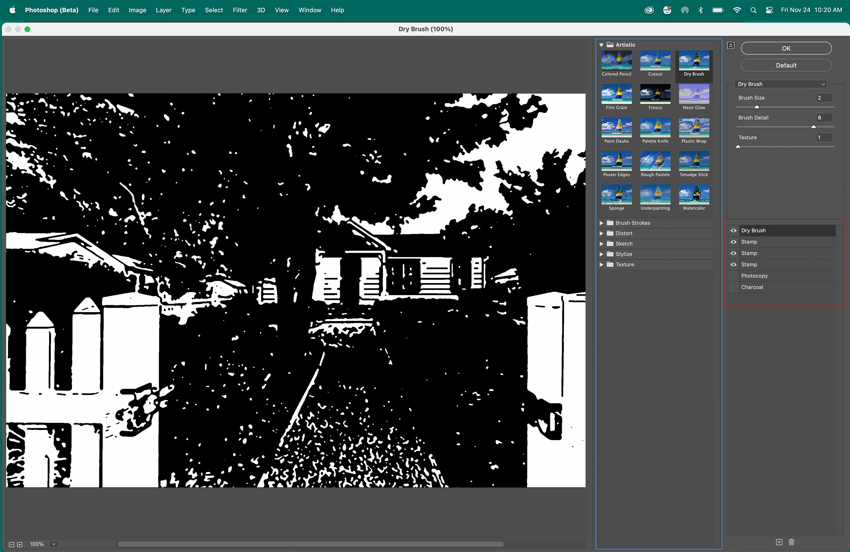 Macbook M2, latest Ventura, latest PS beta. This what what all filters return. This is dry brush, not that it matters. Up until recently everything worked as expected.