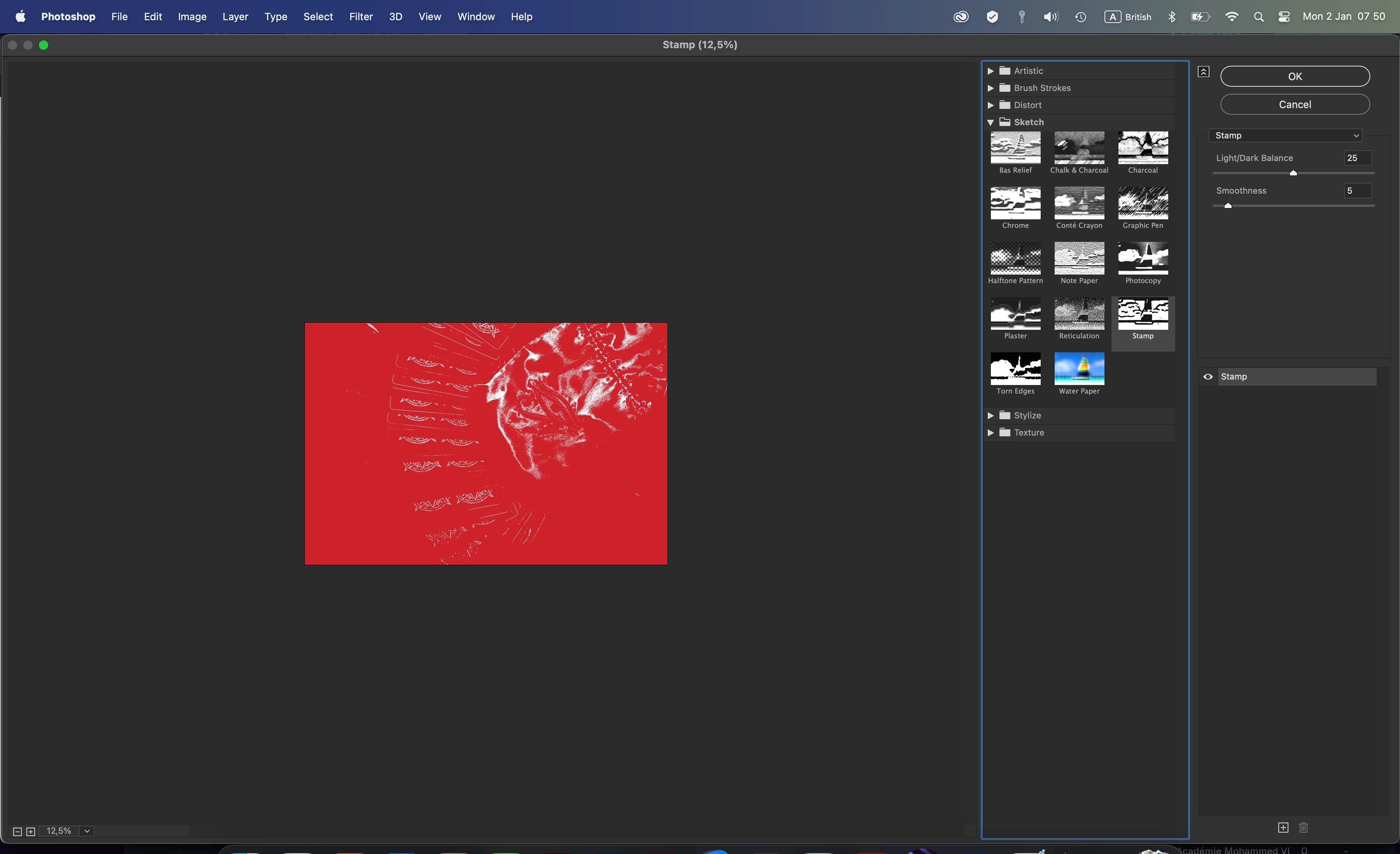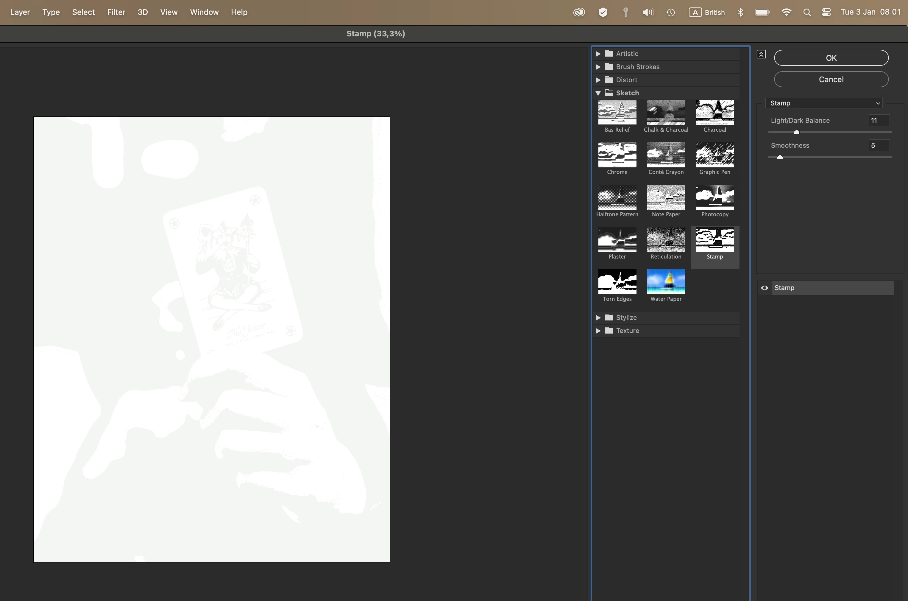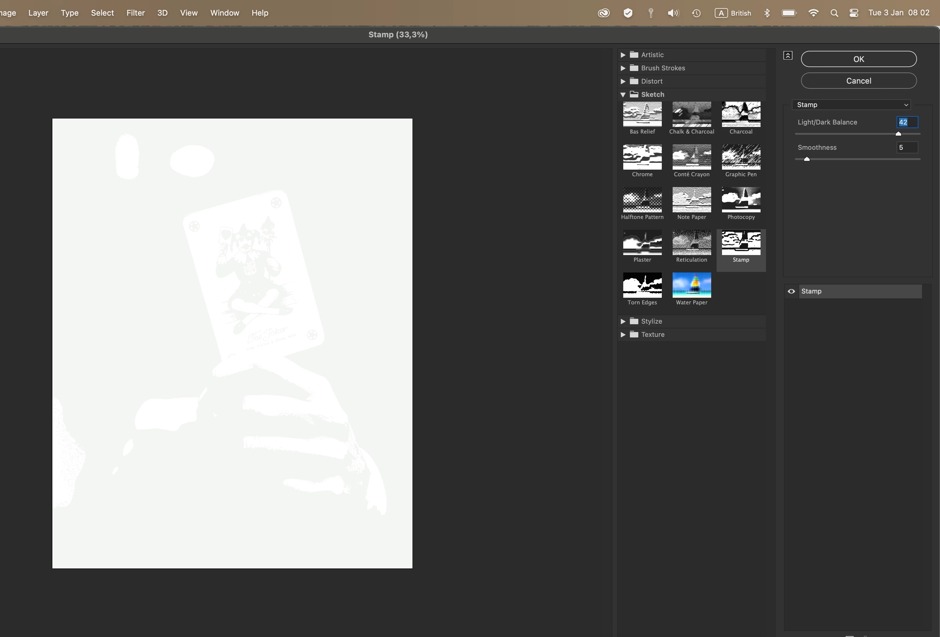"Sketch" and many of the other filters use the foreground and background colors — they don't have to be B&W. We didn't see original colors, but it looked like they were both very pale. The filter worked correctly, but you didn't like it. (Neither did I!)