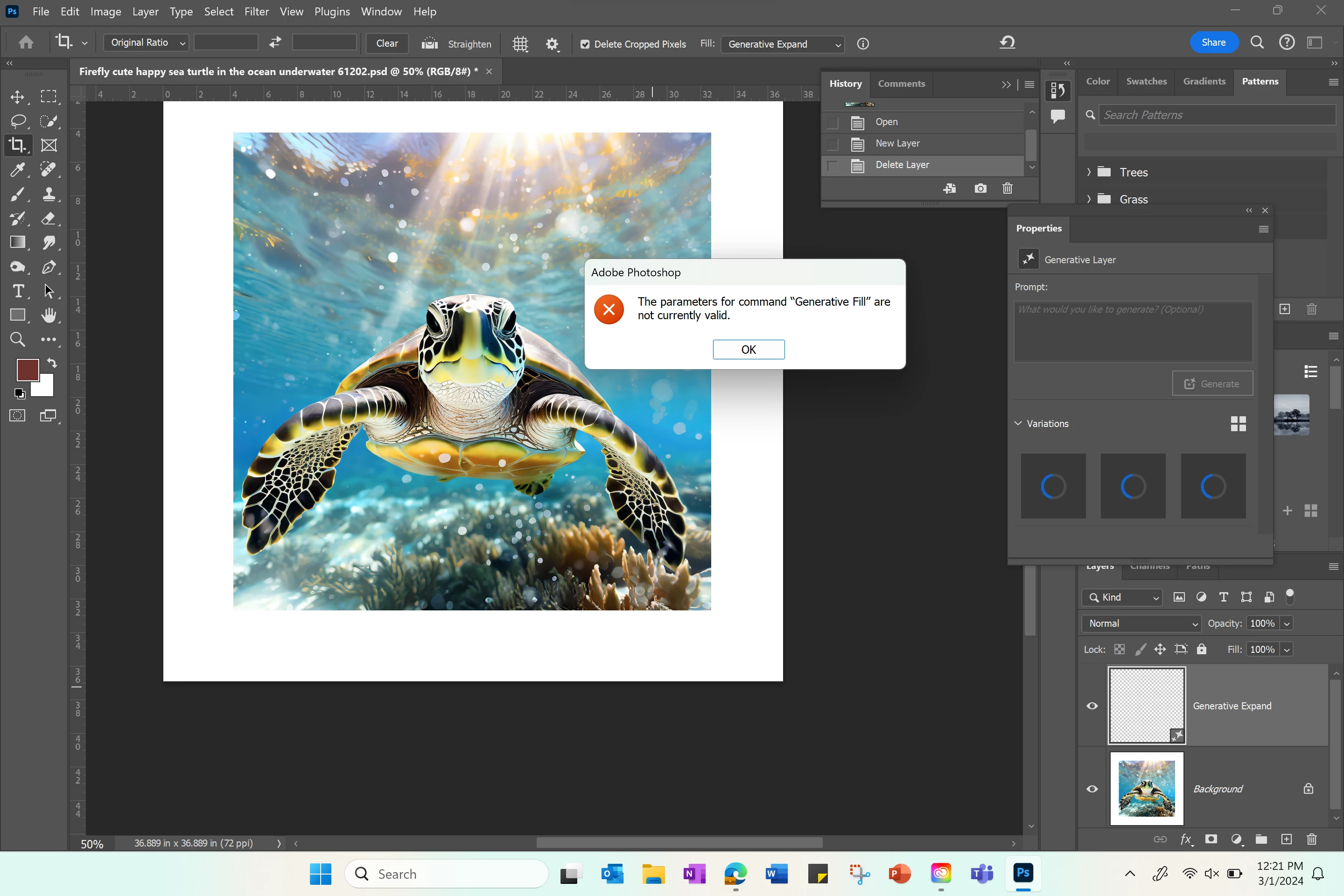 Firefly image error when using Generative Fill in photoshop: Parameters not Valid