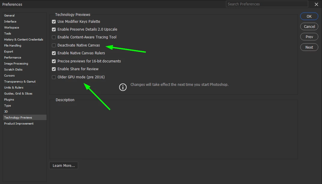 You can try enabling Deactivate Native Canvas to see if it helps, if that doesn't help try enabling the second option highlighted, restart Photoshop on each occassion