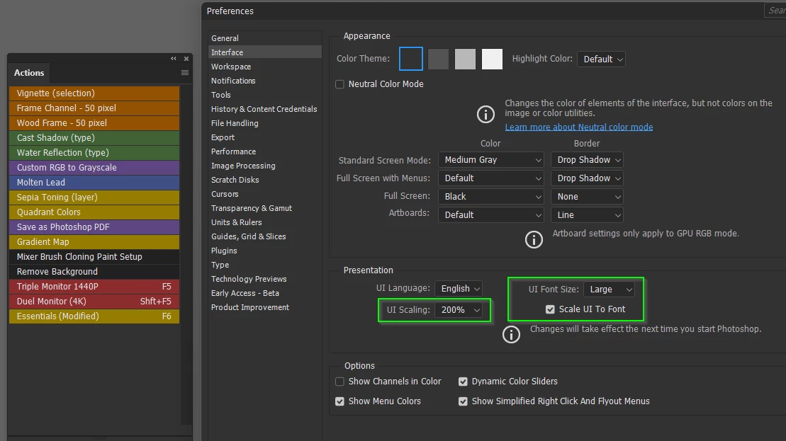 My eyesight is getting worse so I was wondering if there was a way to make the font inside "Actions" larger? I am using windows 11 and the most up to date version of PS CC. Thank you