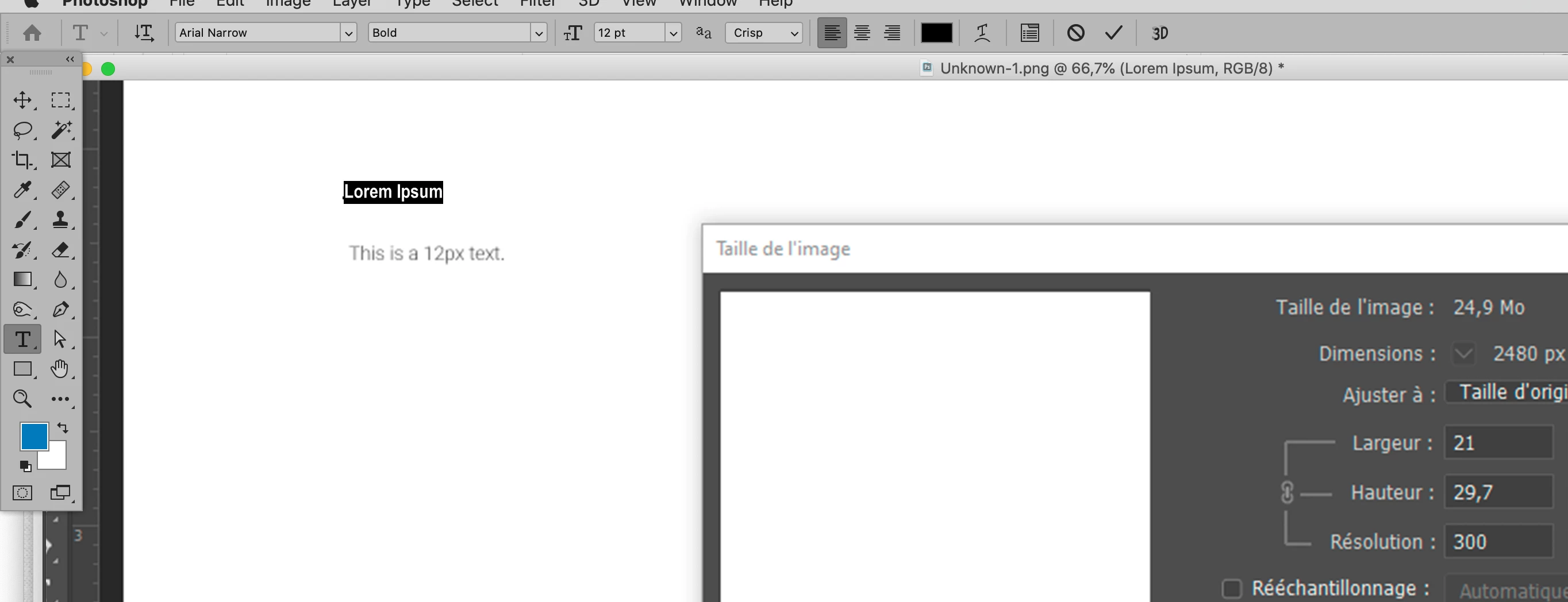 I have checked my image size, and everything is allright. You can check an exemple here of a simple sentence written in 12px on an A4 document with 300ppi. https://prnt.sc/sizsur