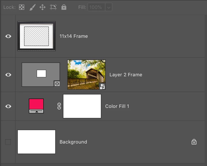 This works but when I drag another photo into this document, highlight the bridge photo in Layer 2 Frame above and hit Delete, it deletes the layer about it too (11 x 14 Frame). Why are these linked and how to do I get it unlinked so I can change photos quickly? Thanks.