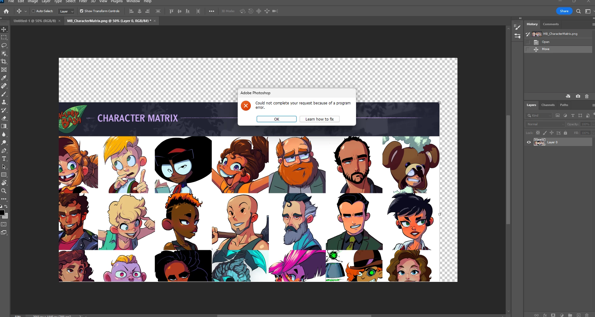 It gives me an error stating, "Could not complete your request because of a program error" every time I try to use the transform handles to resize. It'll let me move it around, but sometimes it'll show afterimage lag. It'll also show low res aliasing at every other zoom resolution, which is, as far as I know, generally a graphics card issue--but this card is supposed to be pretty good and made for this sort of thing, and it worked perfectly find prior to the power surge. I'm attaching a screenshot of the error.