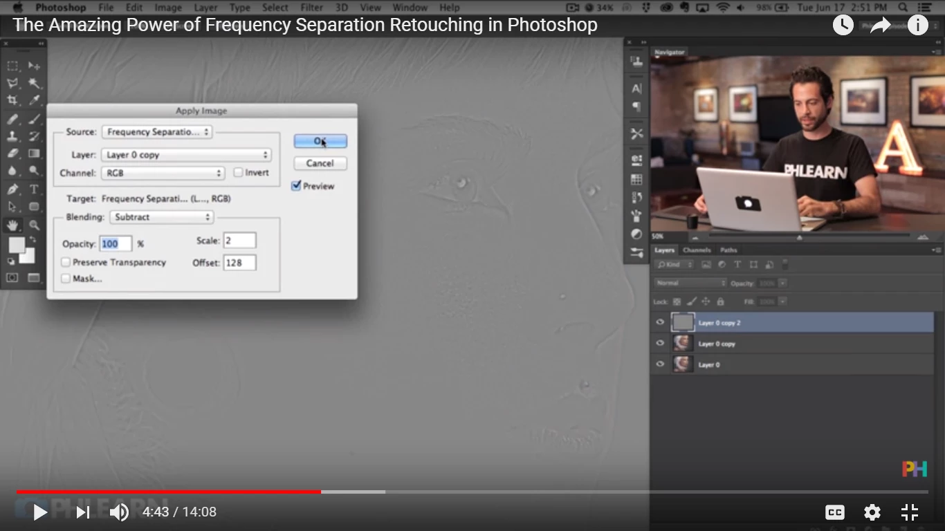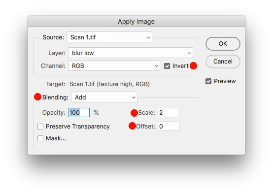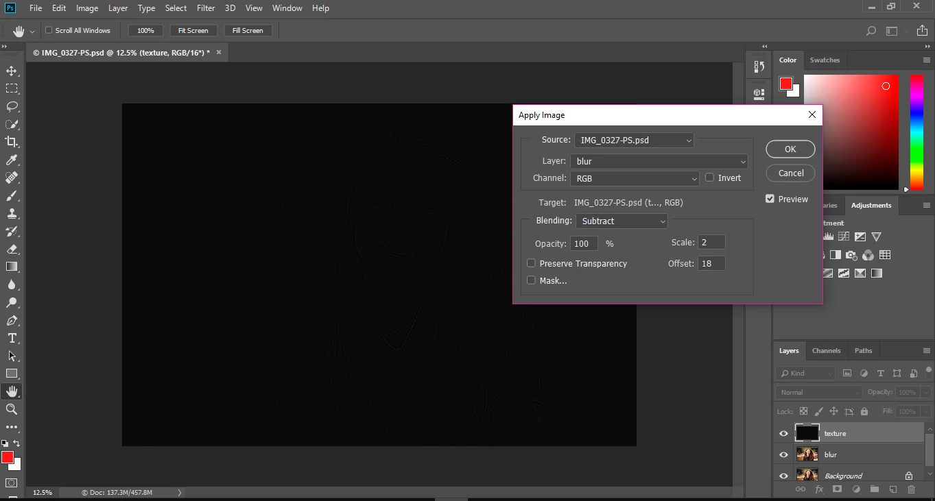 So I made "gaussian blur" and "texture" layers. The problem starts with Apply image - I do everything as it should be done (choose "gaussian blur" layer, bending "Subtract", Scale 2, offset 128) but the image turns into a black color instead of turning into gray and of course accordingly setting a blending mode to "Linear light" doesn't give the needed effect at the end as well.