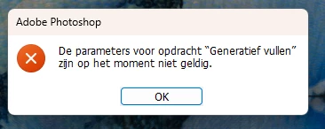 Als ik mijn foto vergroot met de tool uitsnijden en vraag het om generatief te vullen krijg ik deze melding.