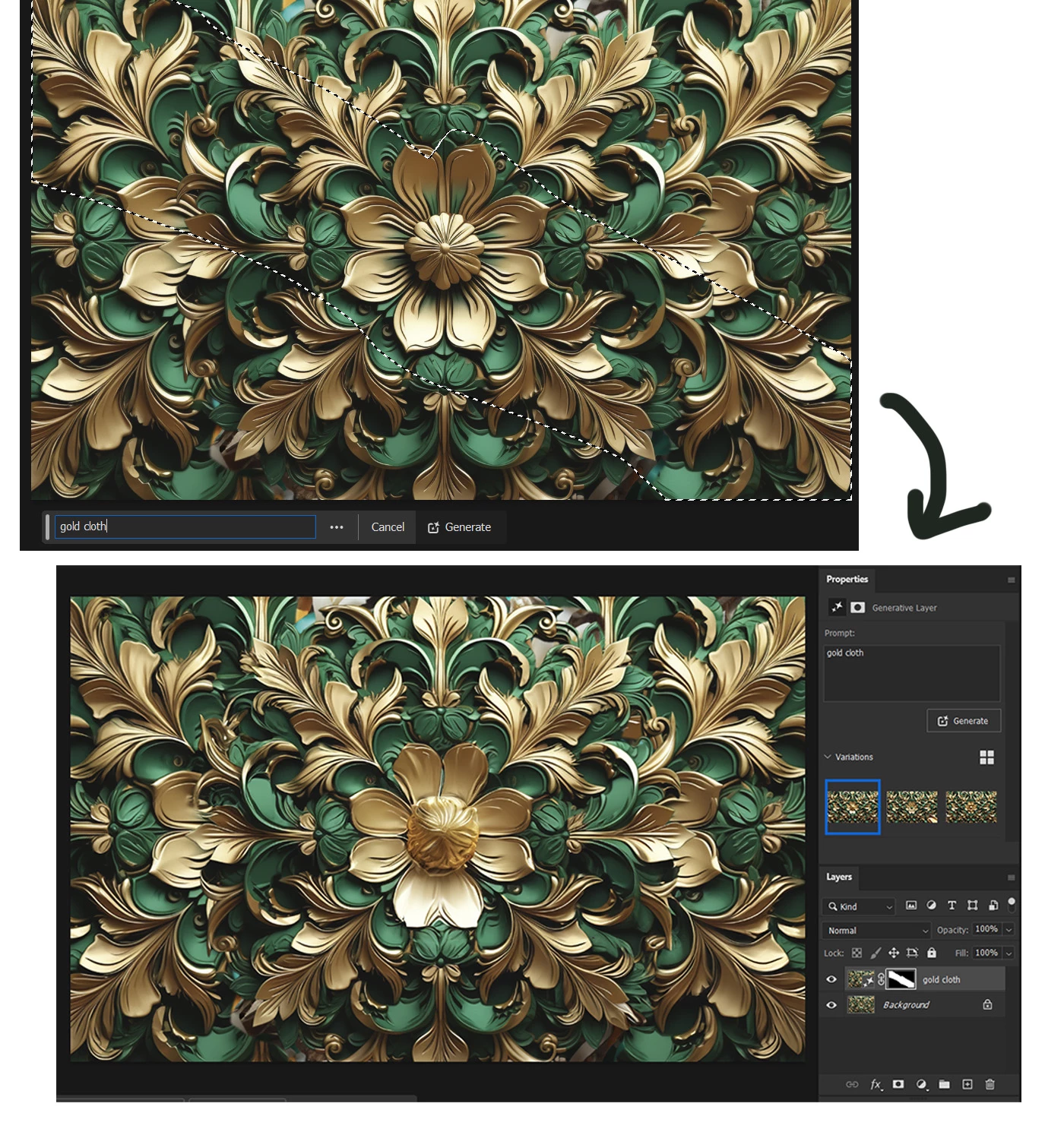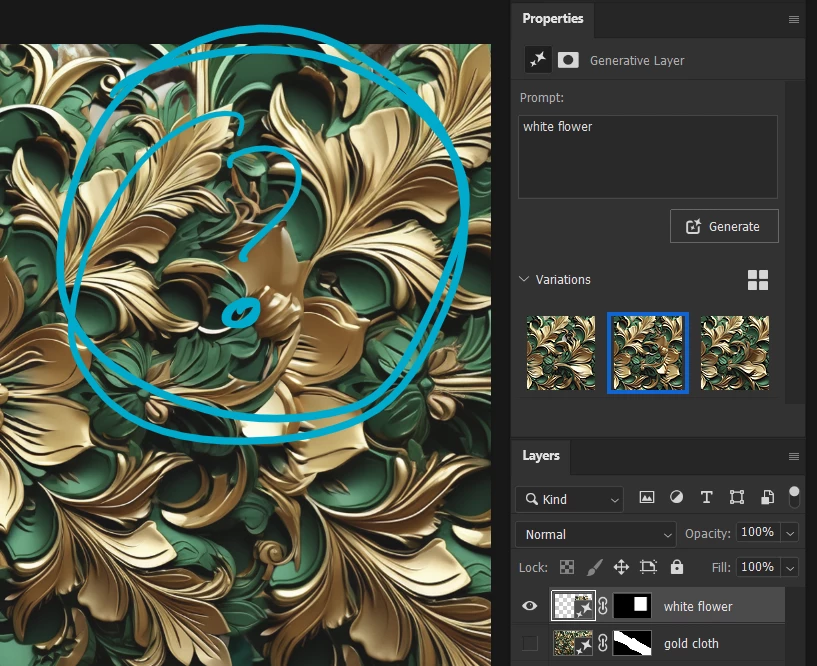 I have an image of an ornament pattern, and I want Generative Fill to add some ribbons or cloth above it. But Generative Fill does not generate any desirable result. Instead, it was just altering the underlying image. I also tried to generate a simple white flower above the pattern, but still not generating anything. (See screenshots)