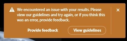 I have some photographs where I would LIKE to change the shirt or clothing of some of my family members.  These are MY photographs that I have taken over the years.   A couple of the photographs are of shirts that are somewhat revealing in nature, NOT nudity, kind of low cut in nature.  If I select the shirt with a selection tool, and try to change the shirt or top using Generative Fill, I get the dreaded Notice that my request violates the Guidelines.    NOTE:   I am NOT creating nudity, or removing nudity, simply trying to replace a Woman's shirt, and a Male Shirt, (Old Tank Top).    am simply trying to create NEW shirts.   So, I do not understand what guideline I am violating.   Again, these are OLD images of mine, where I am just trying to release shirts with NEW shirts.