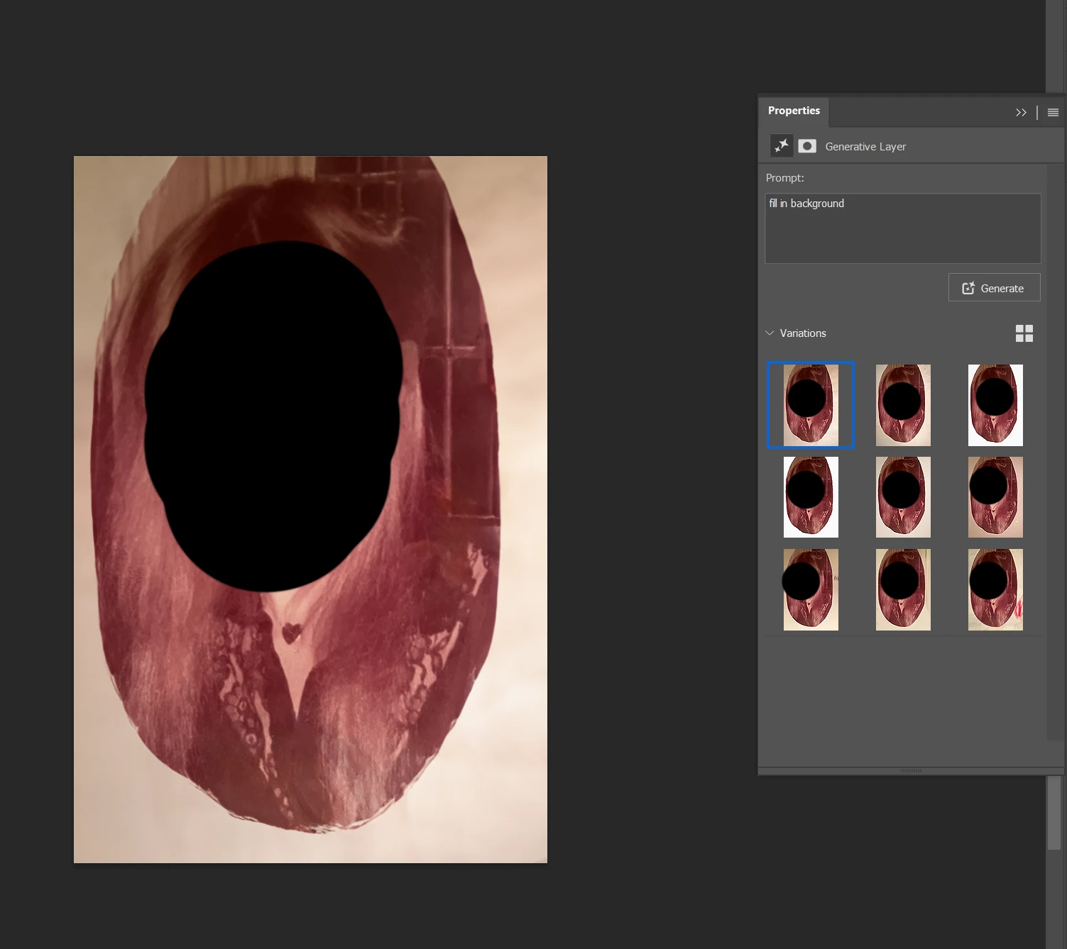 This photo was originally in oval shape with white backround. I've traced inside this oval and then inverted the selection and then apply generative fill. Also tried with first removing the background as well (so it's transparent).