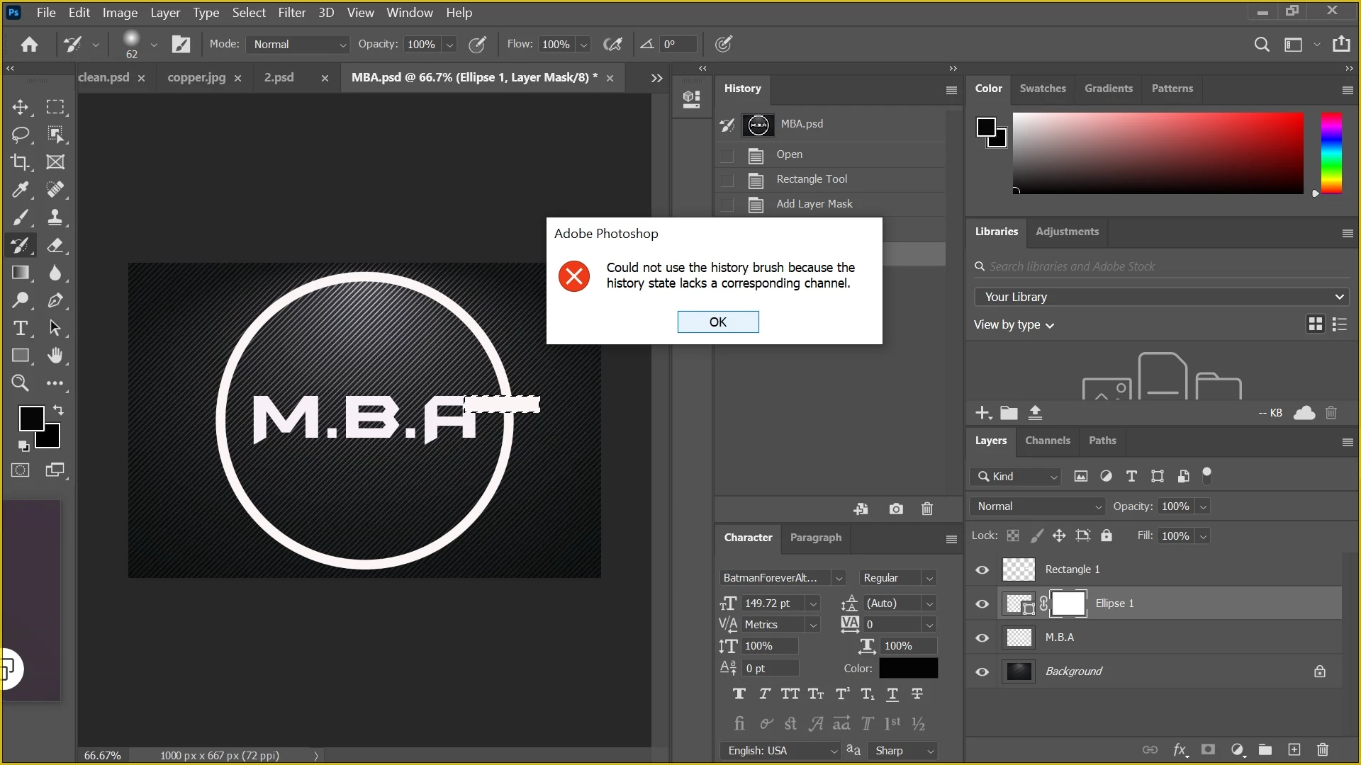 hey i have issue i add mask layer but when i try use history brush i get error plzz can some one help i look all through net still cant find 1 to help me