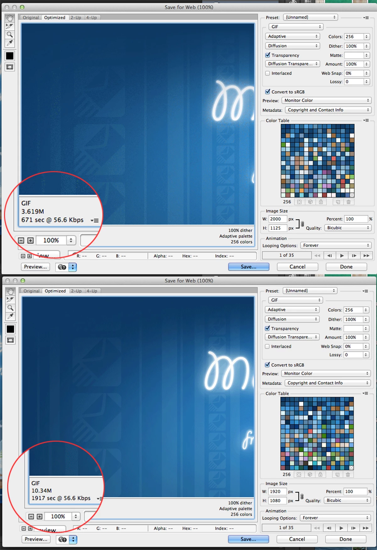 below are two screenshots of the same gif I created. One was optimised already and now Im trying to do it again from the same file but the size is much bigger even though the setting are the same. I honestly cannot figure out what Ive done differently before as the gif was not changed at all from that time.