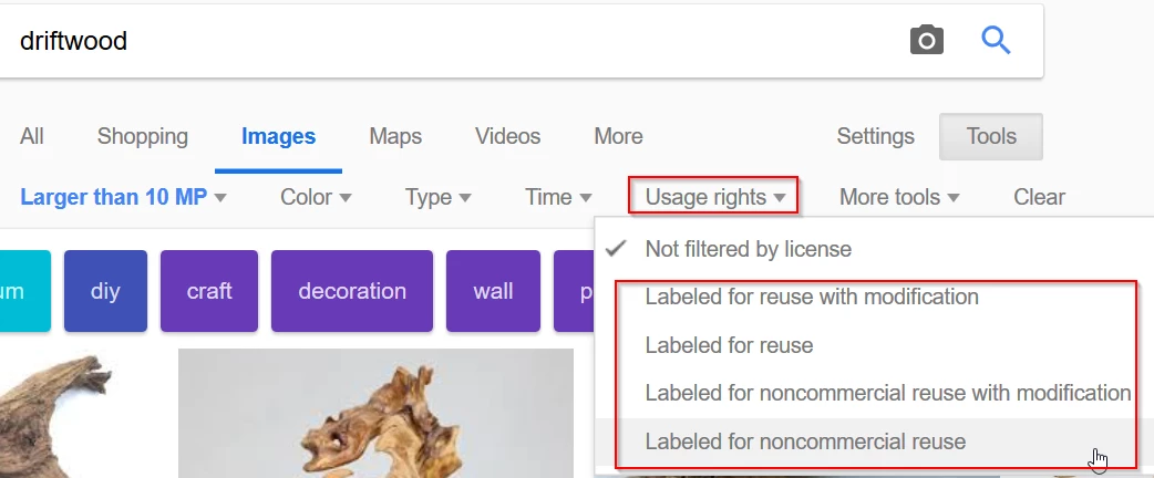 We are now going to need to use the Usage Rights options, and chose one of the reuse options. This bypasses all those stock images from search results, but you still have to jump through the same hoops of visiting the containing website, and finding and copying the image from there.
