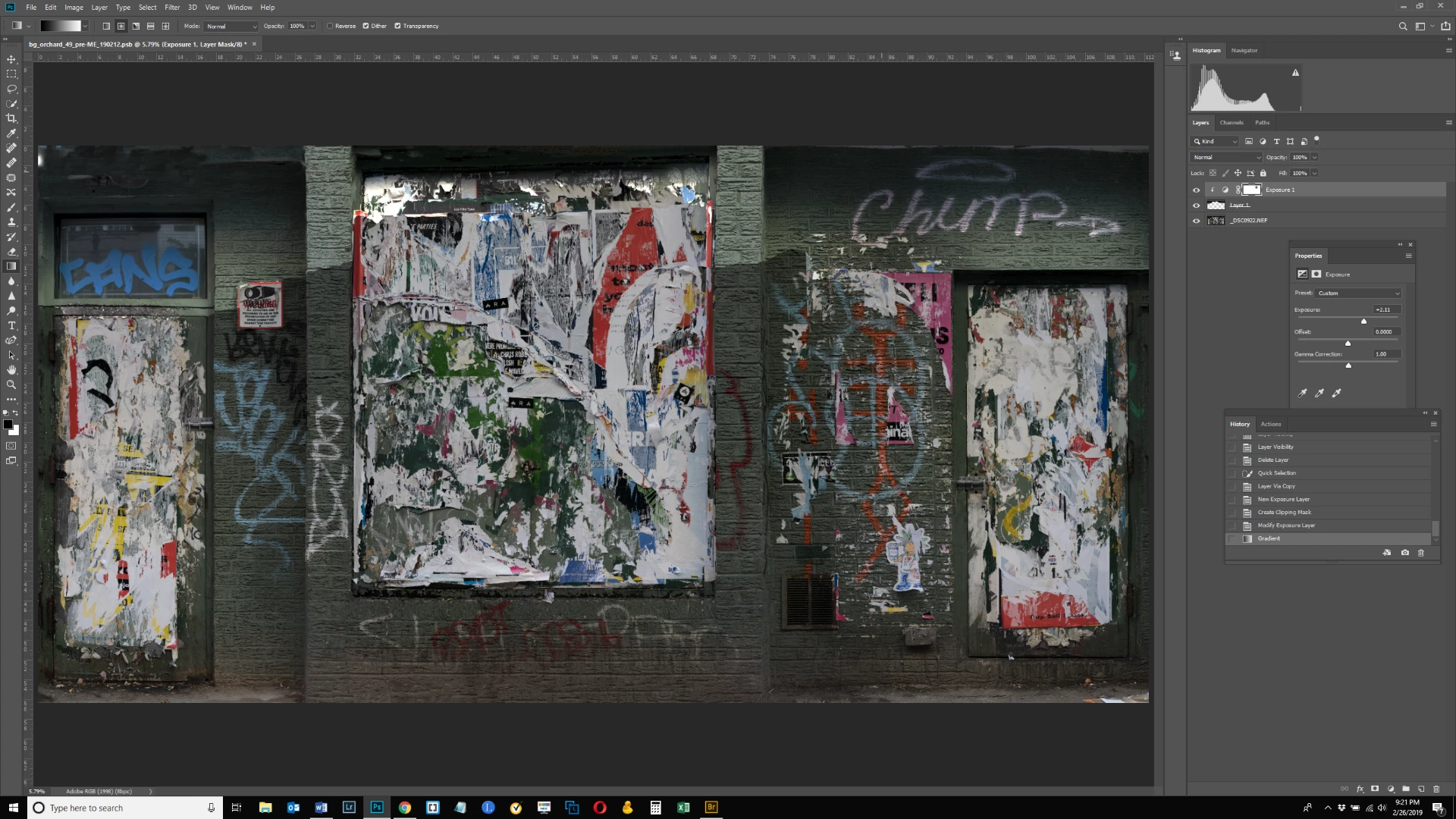 In the image below, the top area is too dark. So I made a selection of it, made it lighter with an exposure layer and then tried to apply a gradient, clicking on the bottom of the exposure layer and dragging up. But the gradient applies only locally - to the immediate area where I am clicking - not across the entire selection layer horizontally. The spot where I created the gradient can be seen right under the letters "Ch" on the right hand side. The selection layer has an uneven bottom border - it's higher up in the middle section on the torn paper and lower on the sides on the brick - is this why the gradient isn't working across the entire layer from left to right? Thanks.