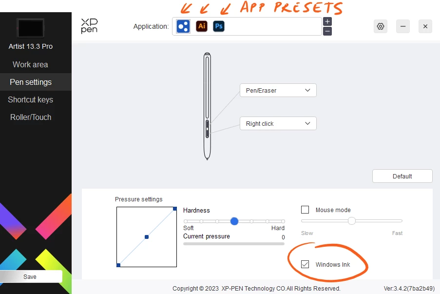 Second one would be to open your graphic tablet app, and check if the Windows Ink is enabled ON ALL THE APP PRESETS (see my screenshot, it should be similar for the Huion)