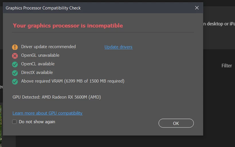 I keep my CPU and Photoshop up to date as a rule of thumb. With the 2 recent updates to Photoshop all of a sudden my graphics processor (AMD Radeon RX 5600 M) is no longer compatible with photoshop on my laptop that i've had and have been using photoshop on for 2.5 years. Not sure why this occuring and there is no option to check to disable/enable the use graphics processor function in the performance settings.