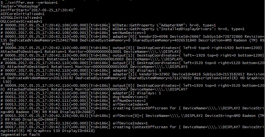 When using the lastest version of Photoshop with my computer (HP Prodesk 600 G2) with AMD Radeon R9 M360 and integrated Intel HD Graphics 530 Running Windows 7 (Build 7601) the "graphics processor" is blank and grayed out under performance. Sniffer.exe also crashes with the configurations. Below screenshot of it running with -verbose=1 shows a segmentation fault during execution while processing the Intel card. And when opening a file, the message about minimum vram requirements for 3d features shows.