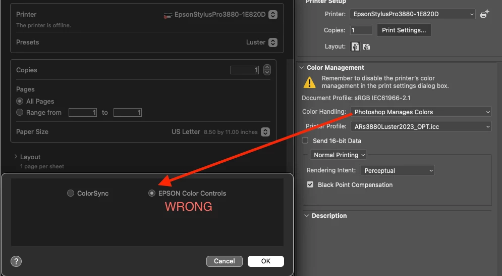 After a forced upgrade to MacOS Ventura, when CC-2018 stopped working, all pure grays become grey-green. At the same time had to install a new driver for Canon's Professional Print & Layout. I use Canon's PPL, which I have been very happy with, the colors on the finished print have always matched the colors on the screen, but not anymore. Also tested Photoshop's own print, but it remains the same green tone. It is very frustrating as galleries wait for prints.