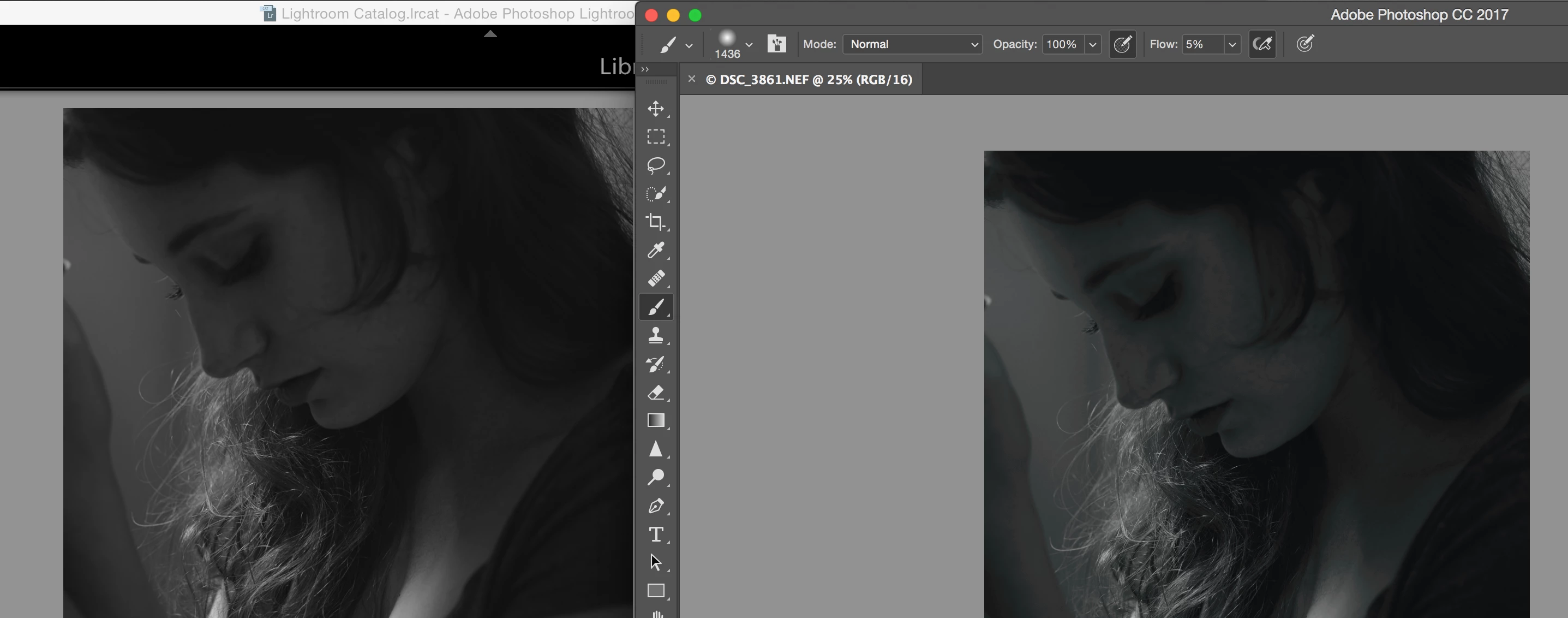 I'm trying to finish editing a black and white image in photoshop that I started working on in lightroom. I'm using the latest versions of Lightroom CC and photoshop CC.