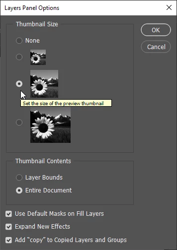 Which icon is displayed in the Layers panel also depends on Layers Panel Options. Select any layer then click on Layers panel menu and choose Panel Options. In the dialog which appears change Thumbnail Size.