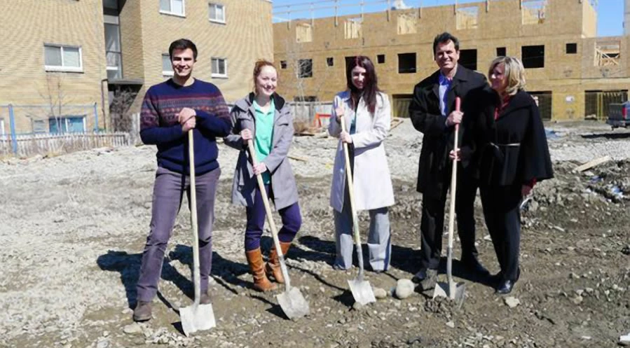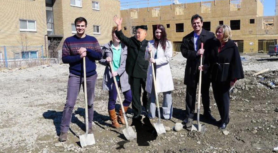 Yeah it's been edited, but the image is so low res that it is difficult to tell how much editing or why. Something looks wrong with the right foot of the guy in question. Look at the space between his foot and the shovel. Looks like half his foot is missing. There are also some repeated patterns usually caused from cloning along the right edge.