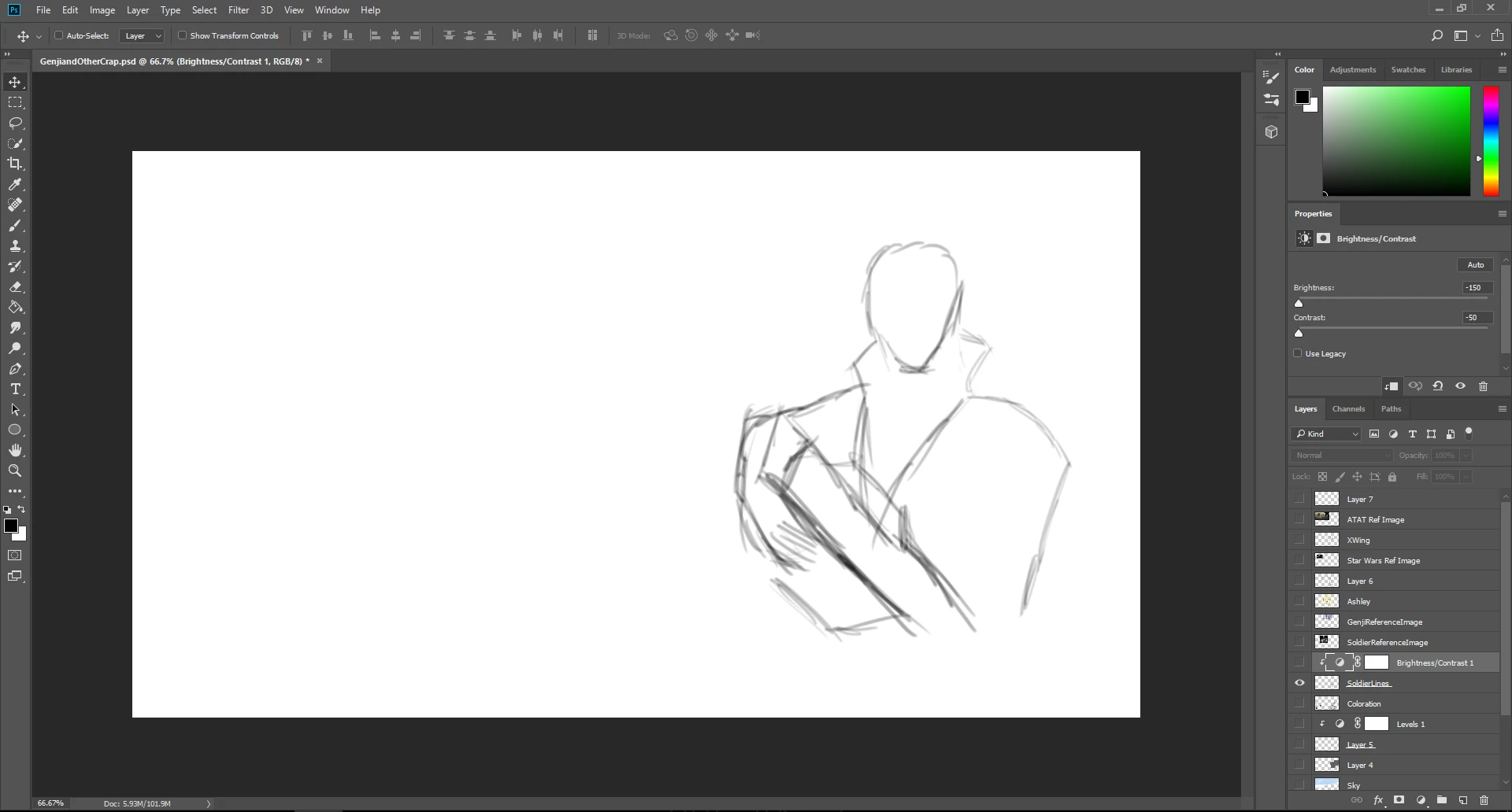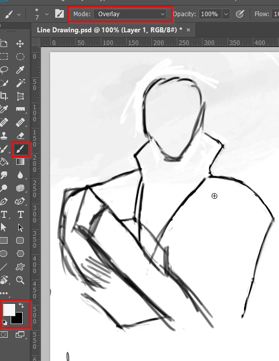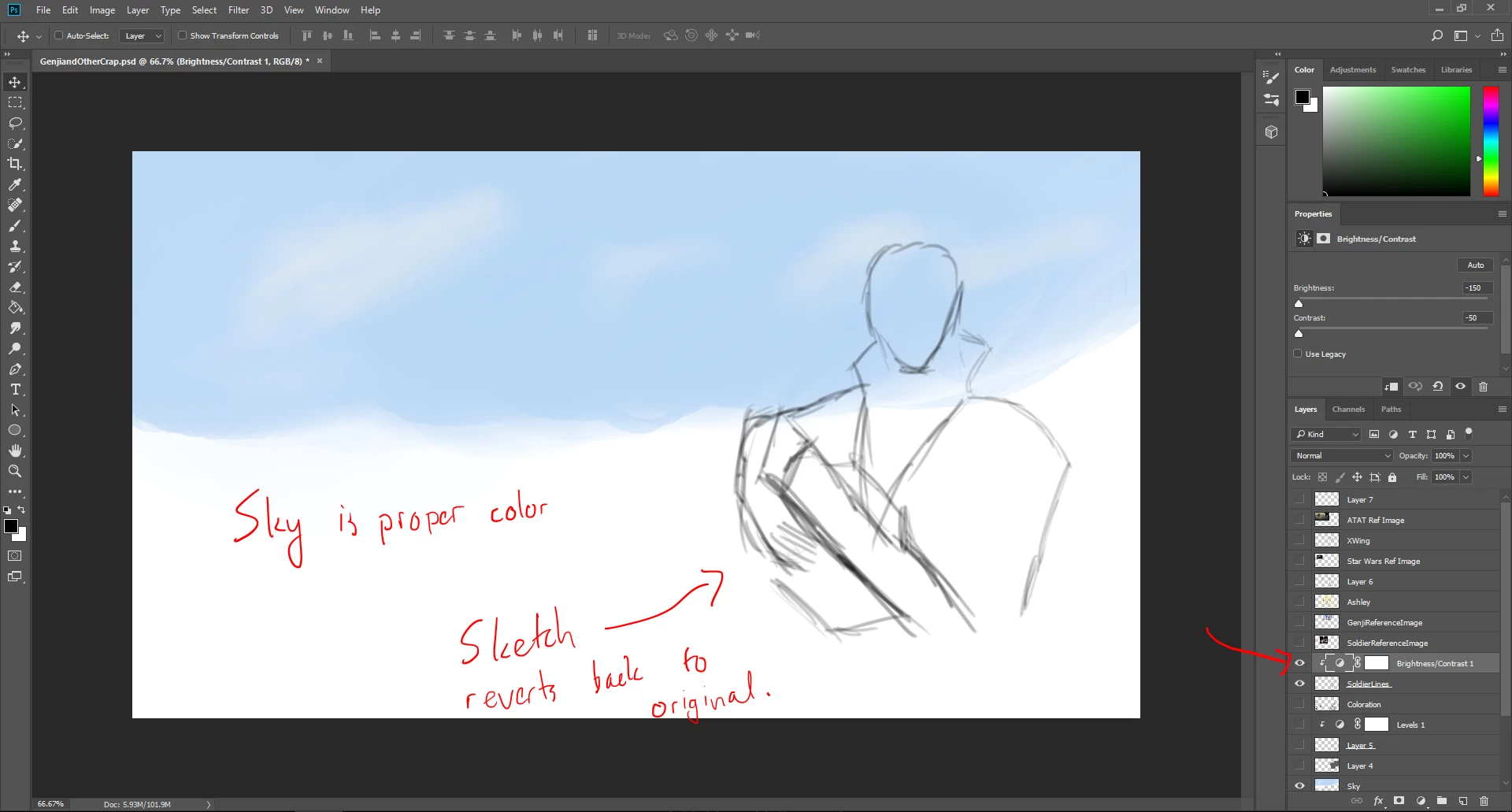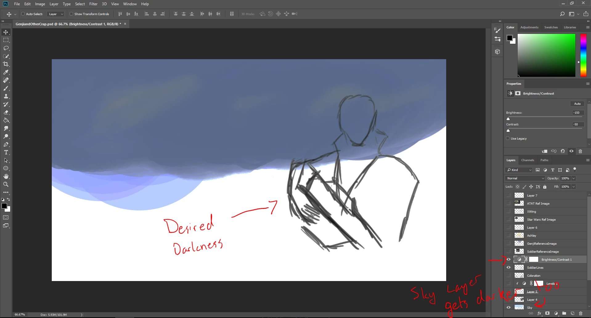 My goal is to darken the lines in that layer, the grayscale lines that I have for my initial sketch. Is there no way to do that without making every other layer underneath it darker?