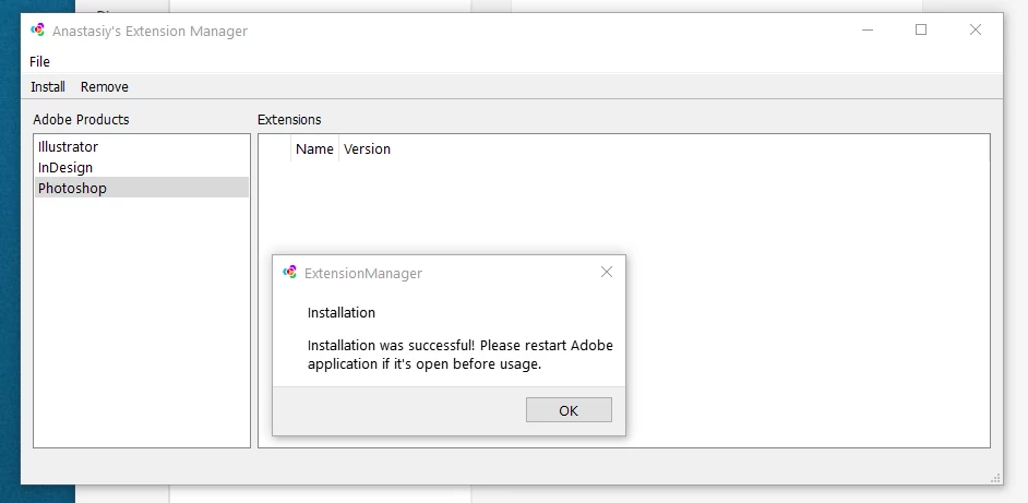 I also installed it manually on one of the windows machines using Anastasiy's Extension Manager. I get a "Installation was successful! Please restart Adobe application if it's open before usage" prompt: But I dont see anything related to the plugin/Action when loading PS.
