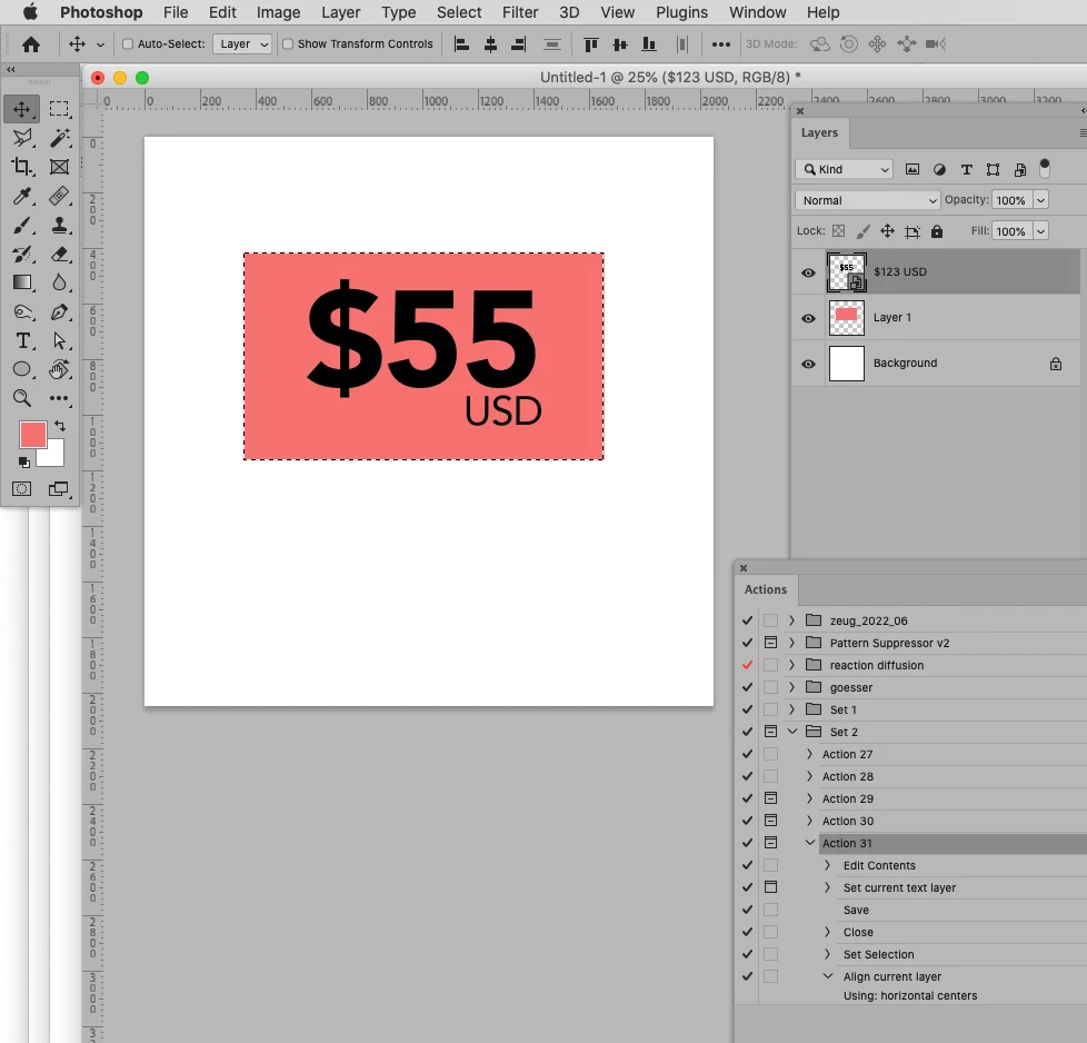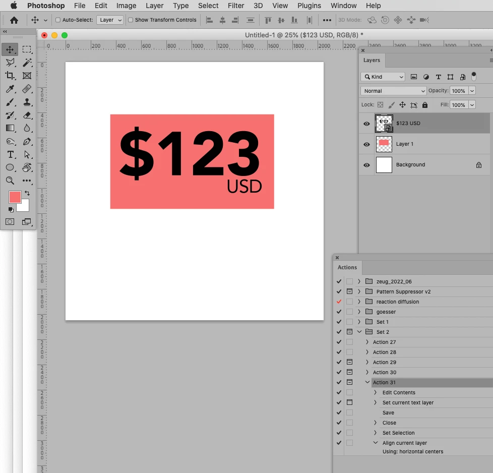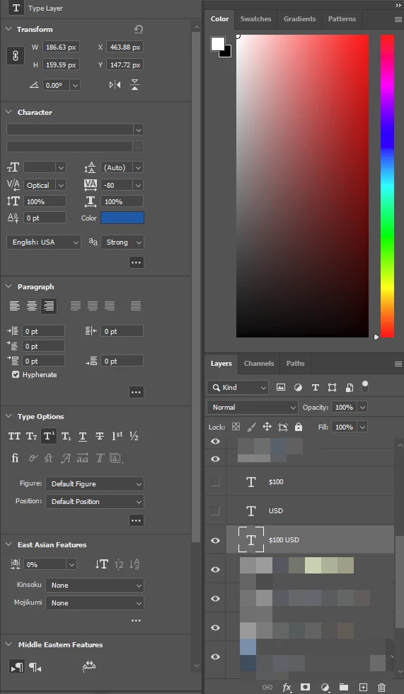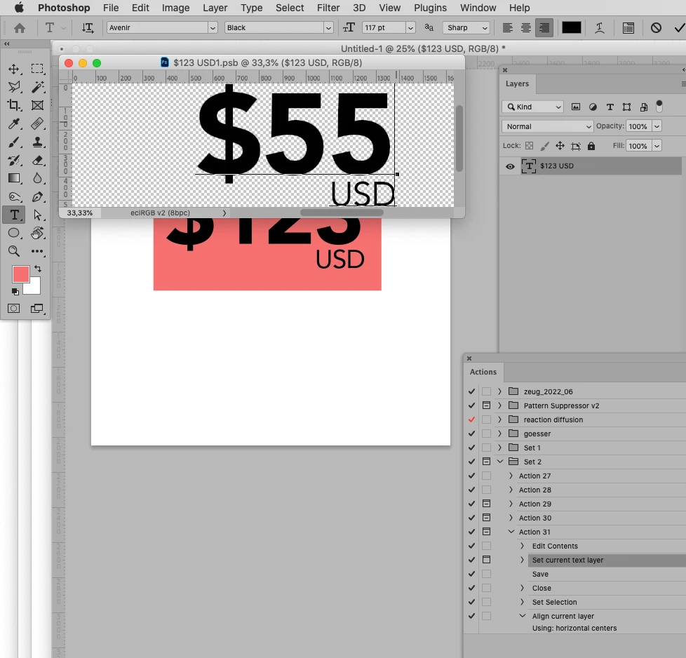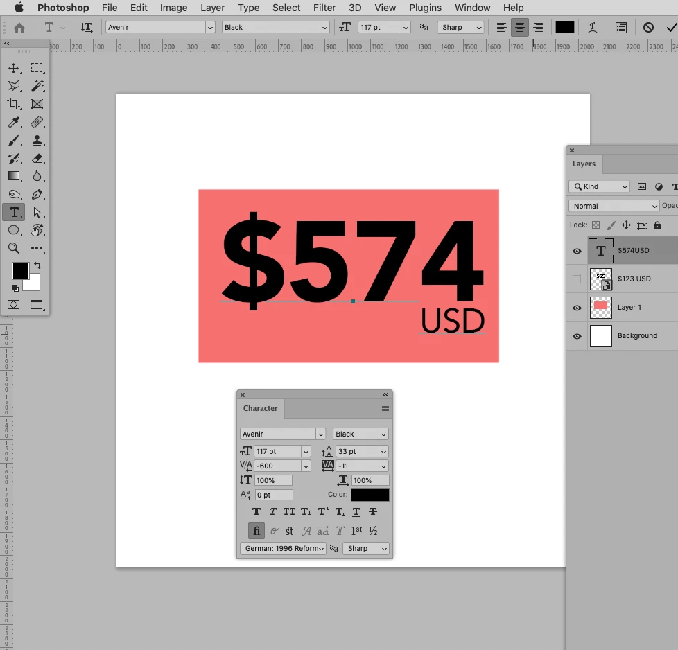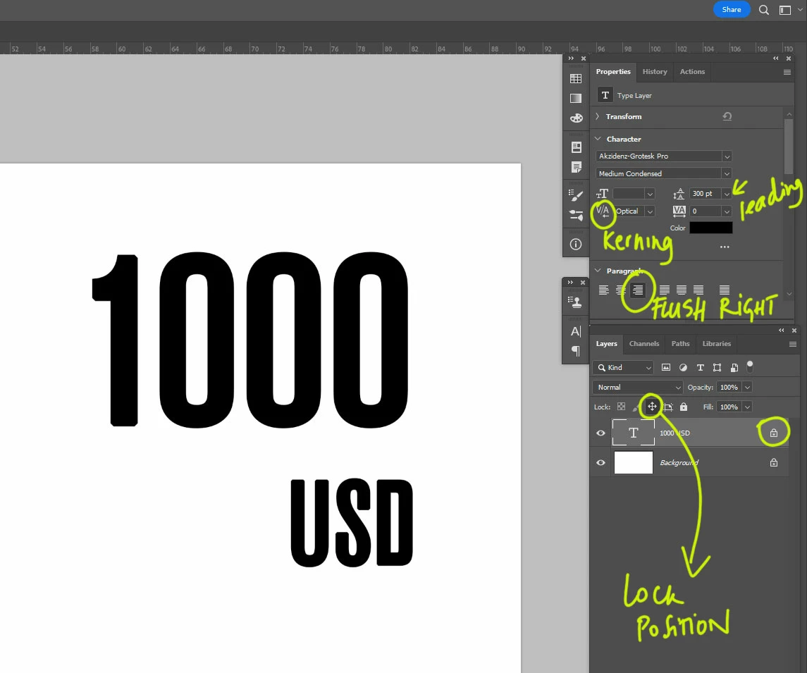 Im designing an image with a price written on it. I need the currency "USD" to always appear exactly below the last number (no matter how long/short the price is). I have hundreds of images to apply this to and the price will vary from $1 to $2000, so I need it done automagically where the only thing I have to do is just change the number without having to re-align the currency for every different price.