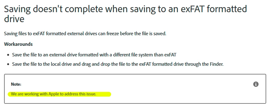 Is Adobe aware of the issue that arises nearly every attempt to save a project in PS20 to an external drive on a mac. It is never able to complete. It has devistated days of work and numerous projects.